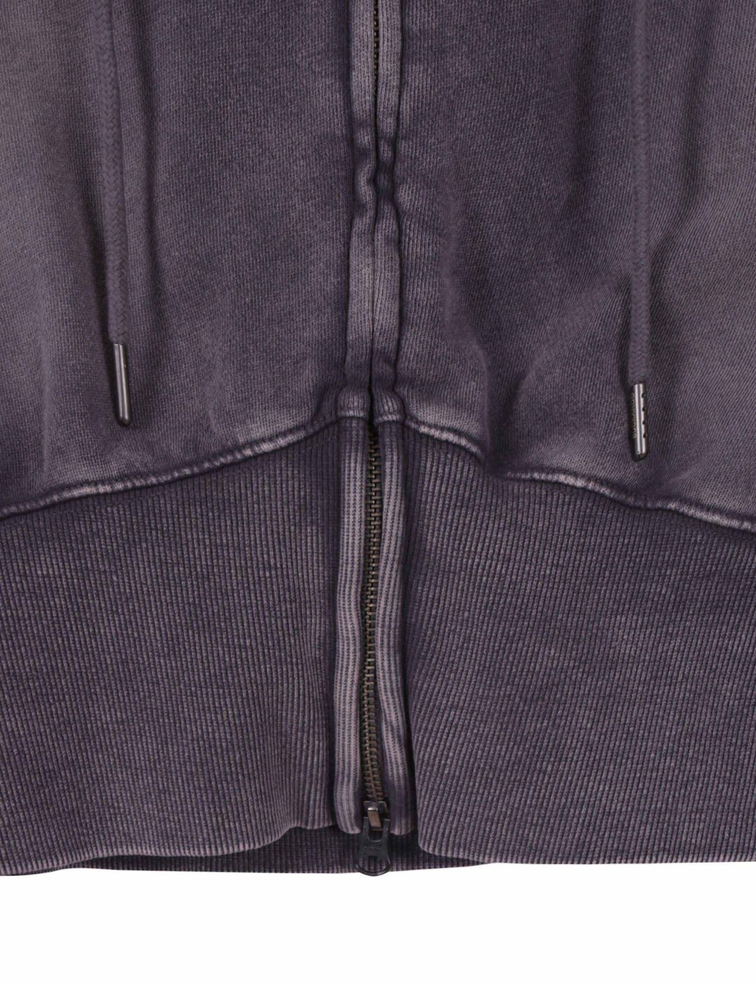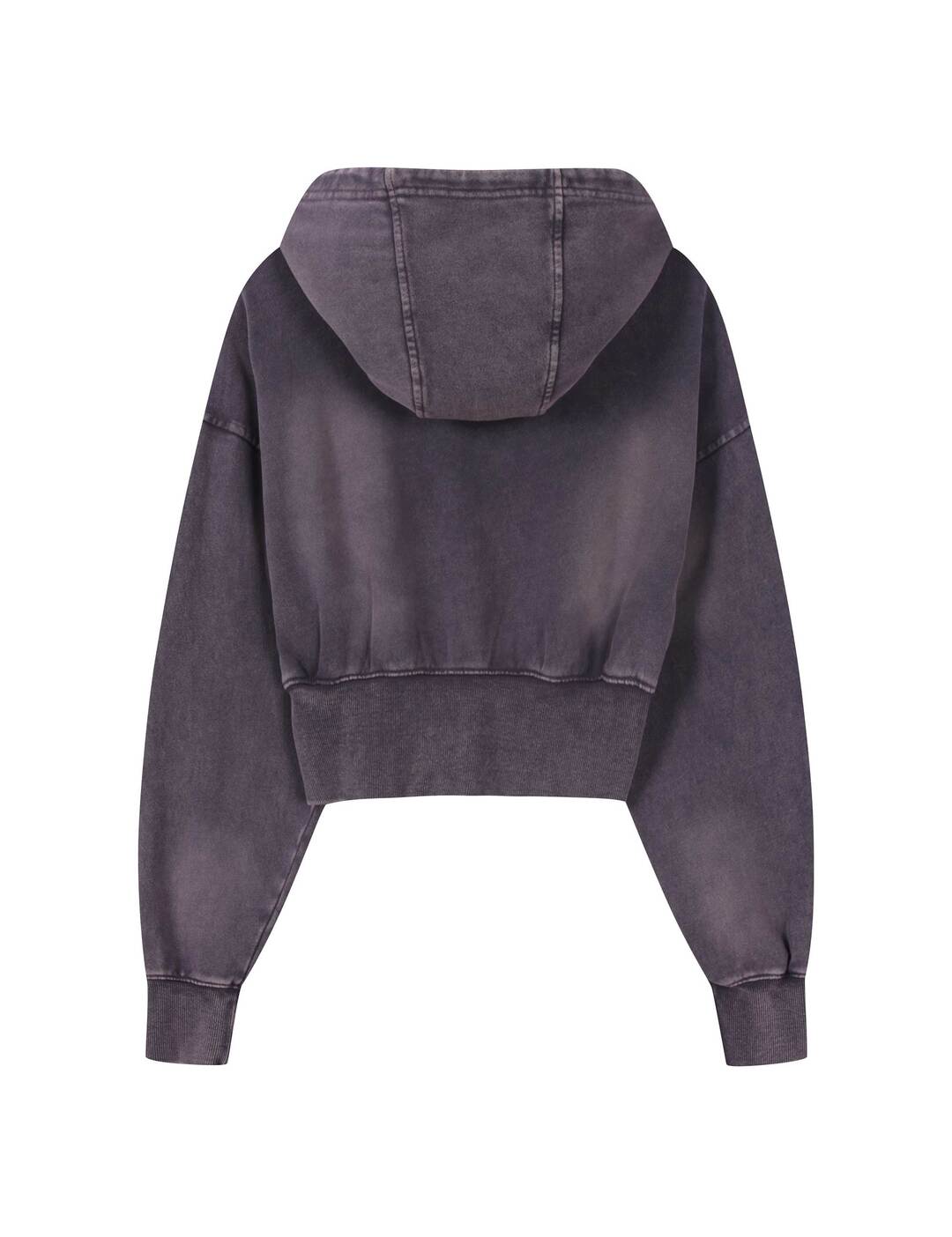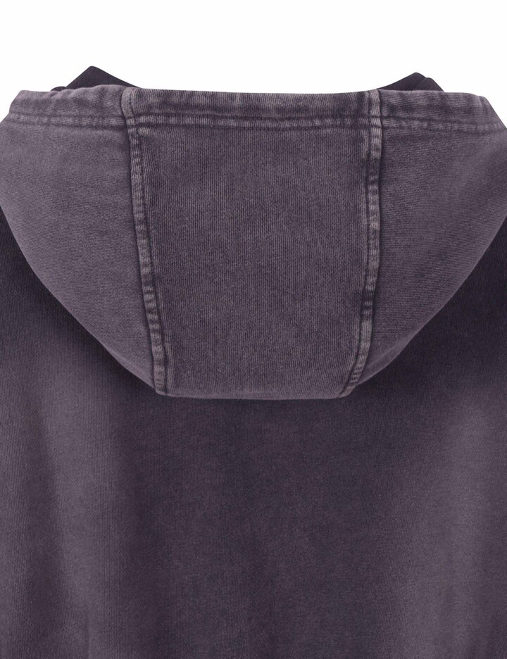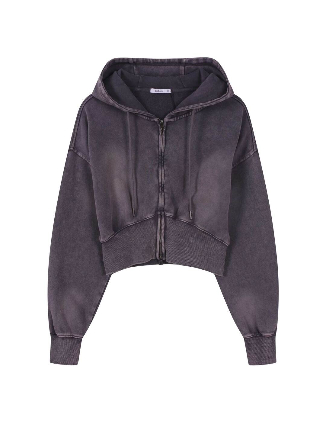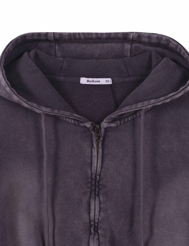 빈티지한 워싱감에 블리치 기법을 더해 자연스럽게 에이징된 무드가 돋보이는 크롭 기장의 후드 집업입니다.