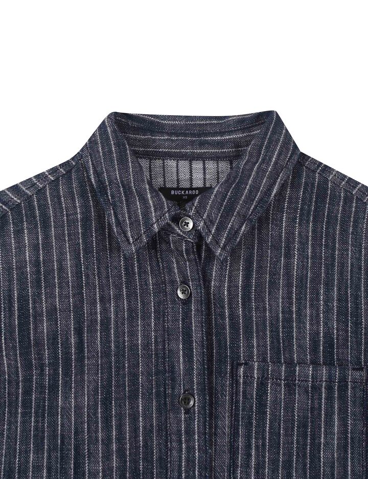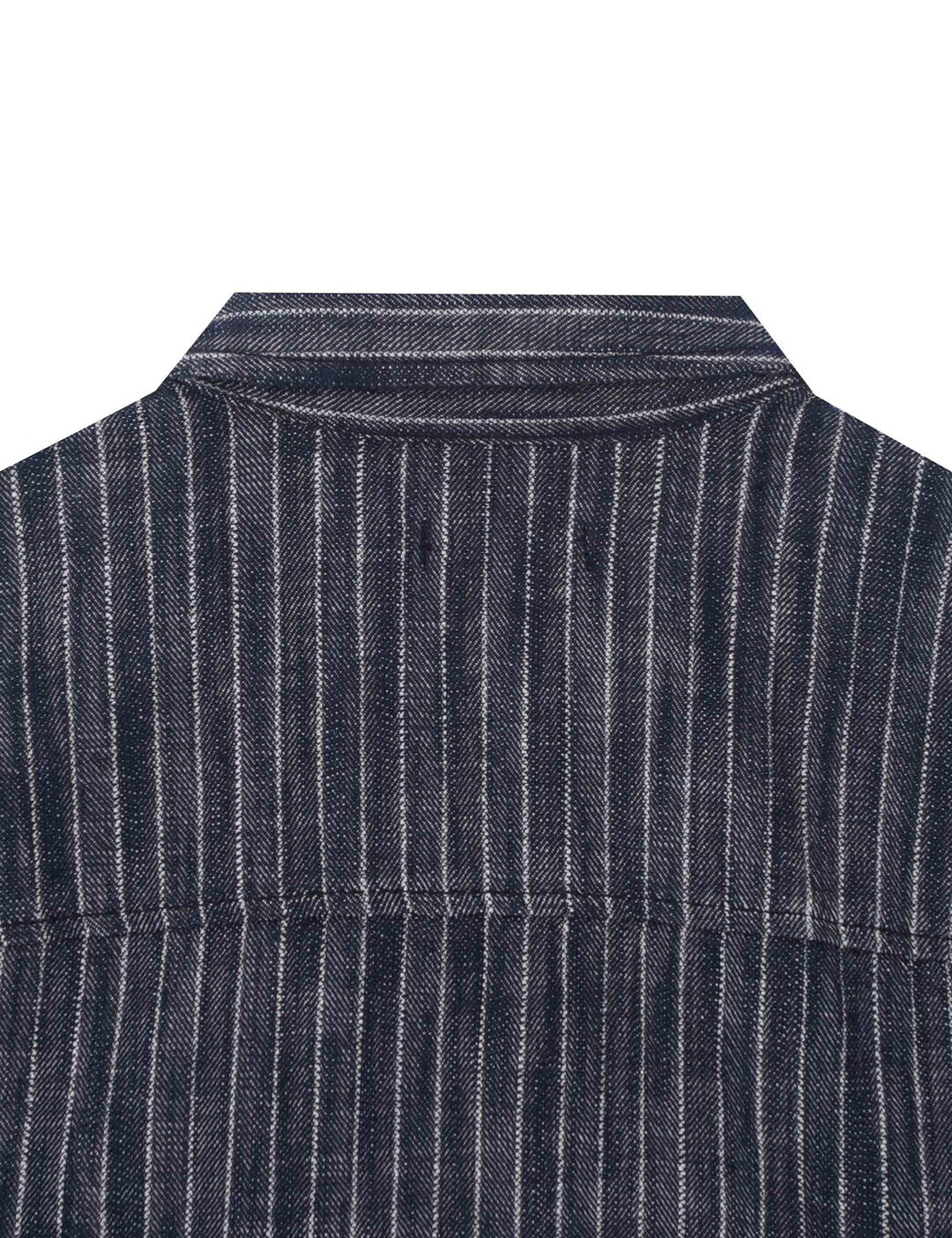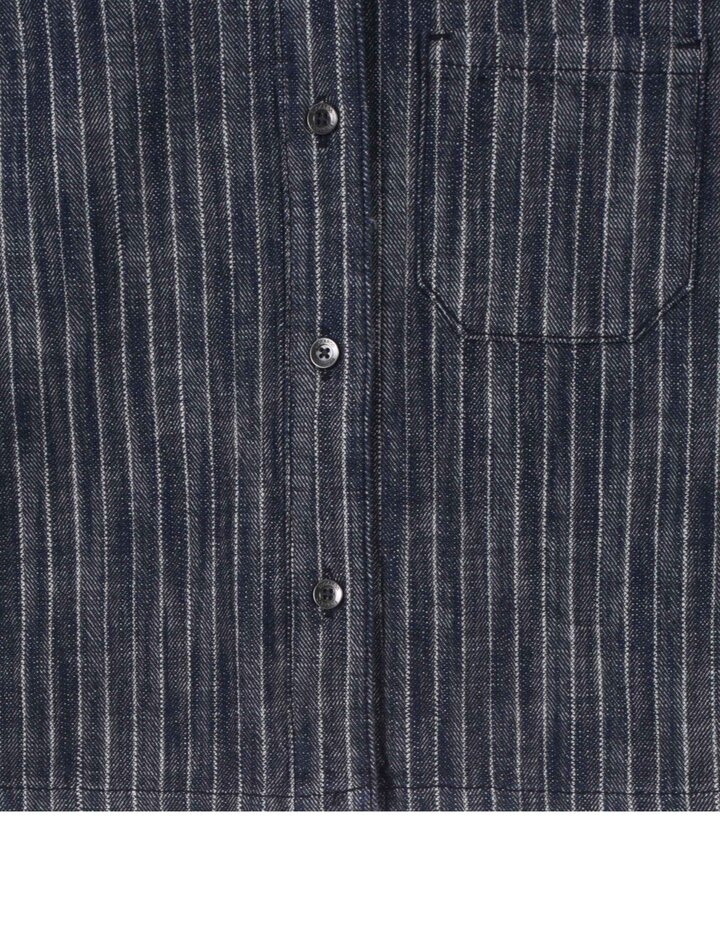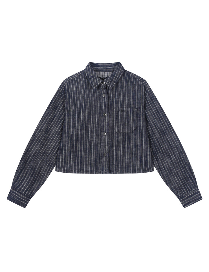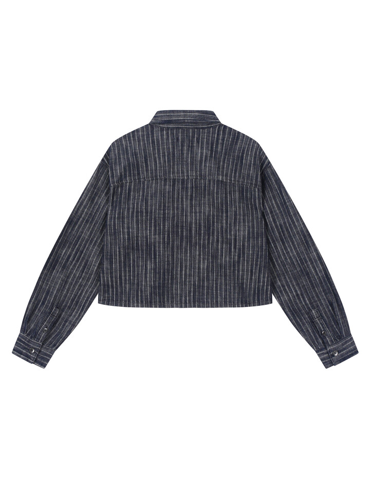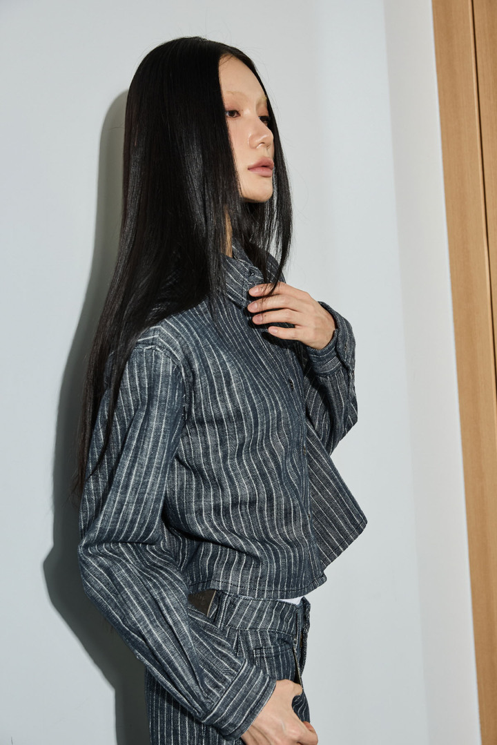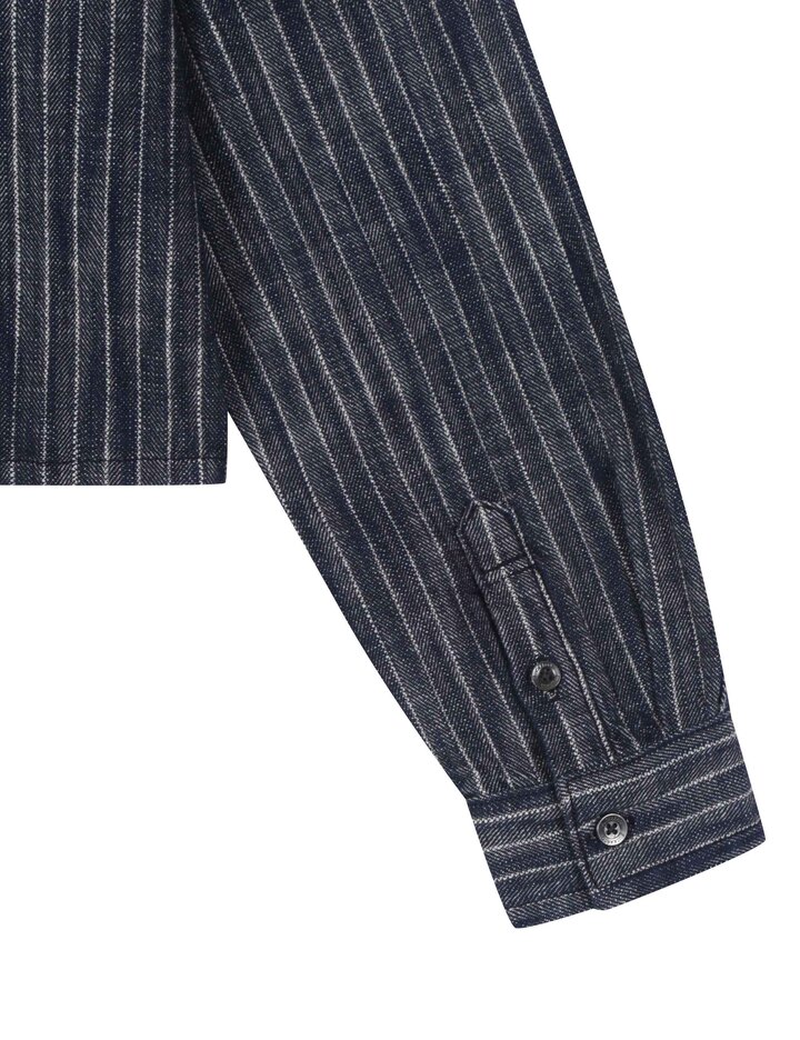 *인디고사로 짜여진 스트라이프 원단의 데님셔켓으로 여유있는 핏감의 크롭기장이며