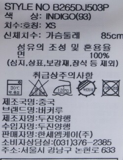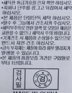 | 세탁방법 및 취급시 주의사항 | 중성세제로 단 시간내에 세탁하십시오.(케어라벨참고) |