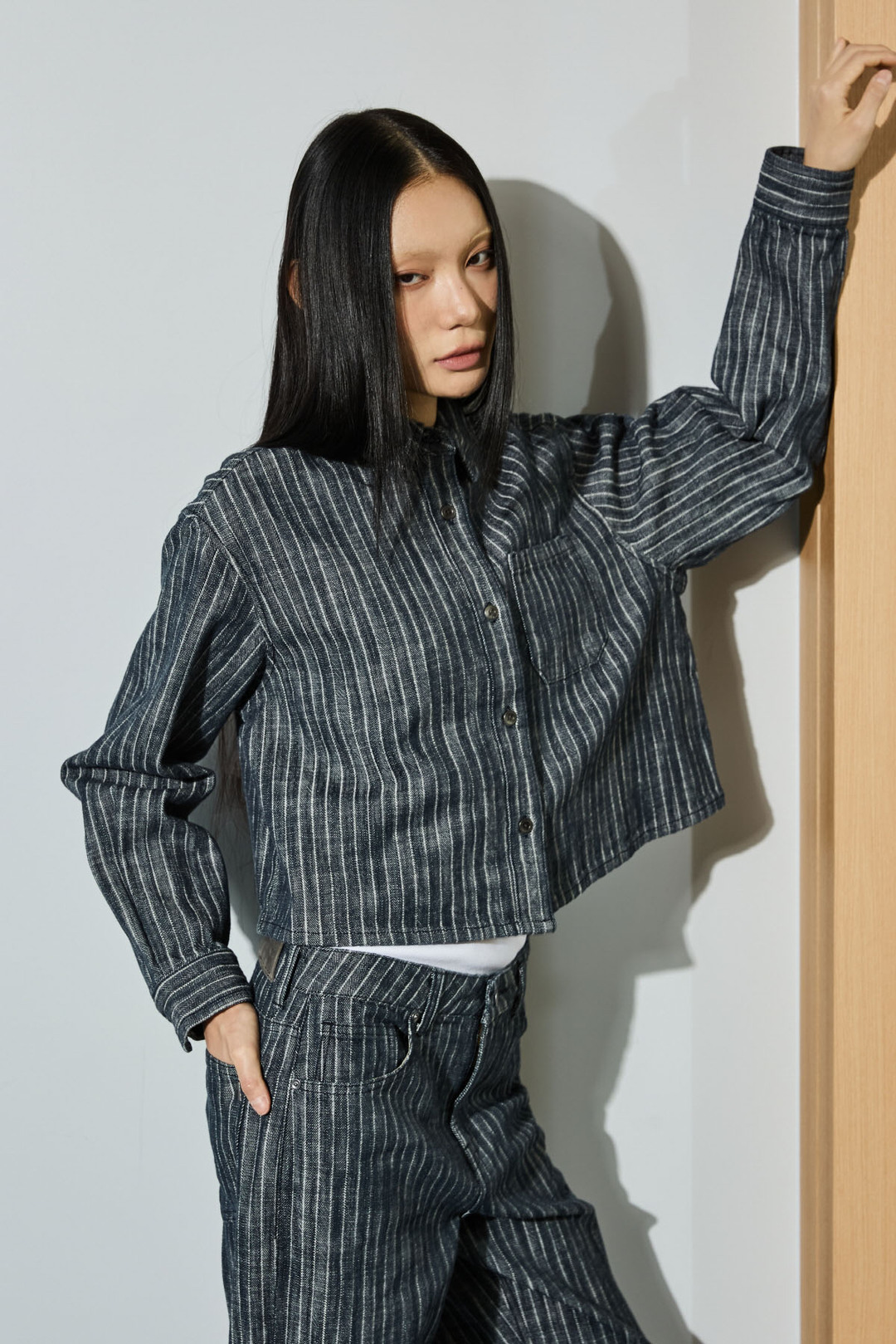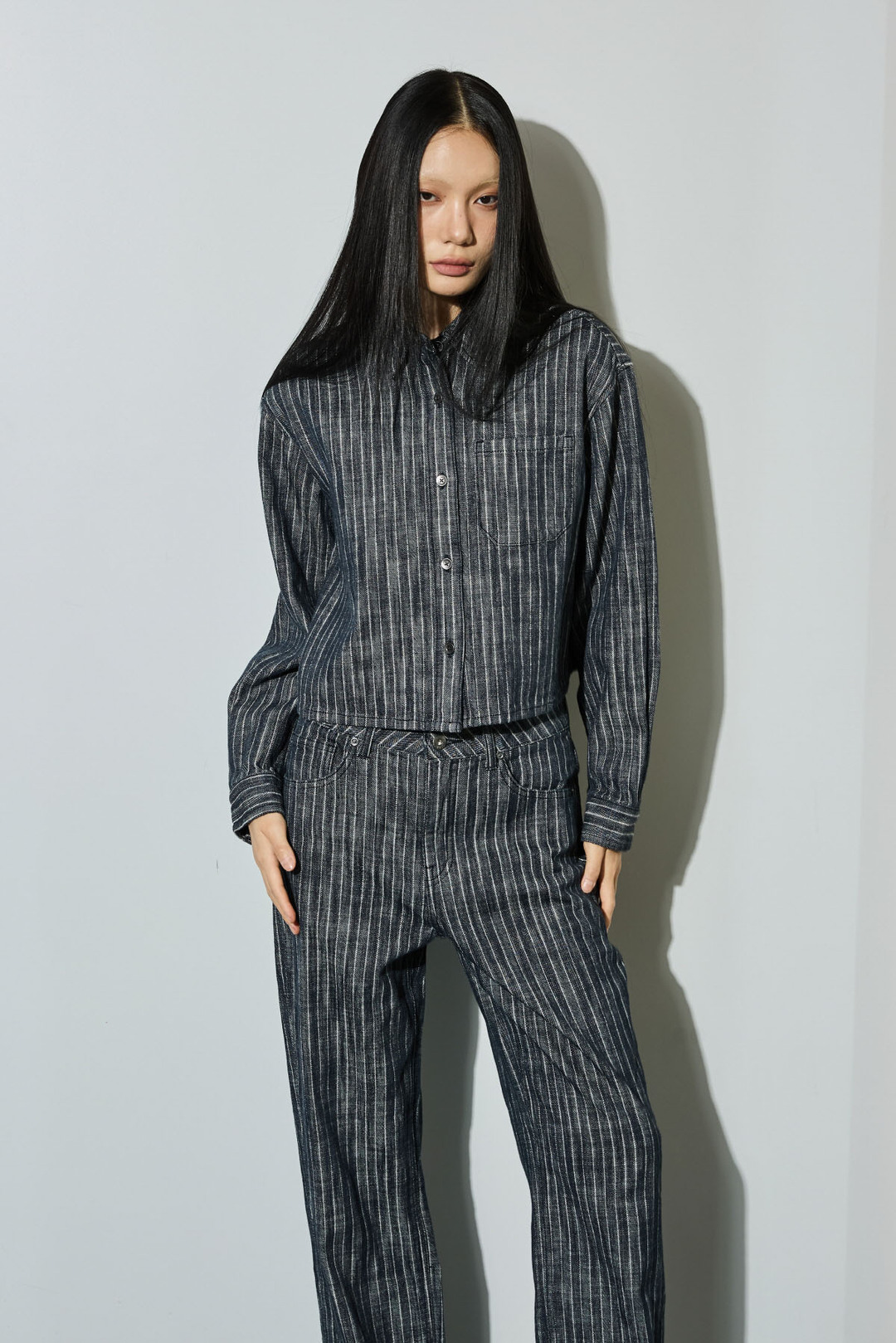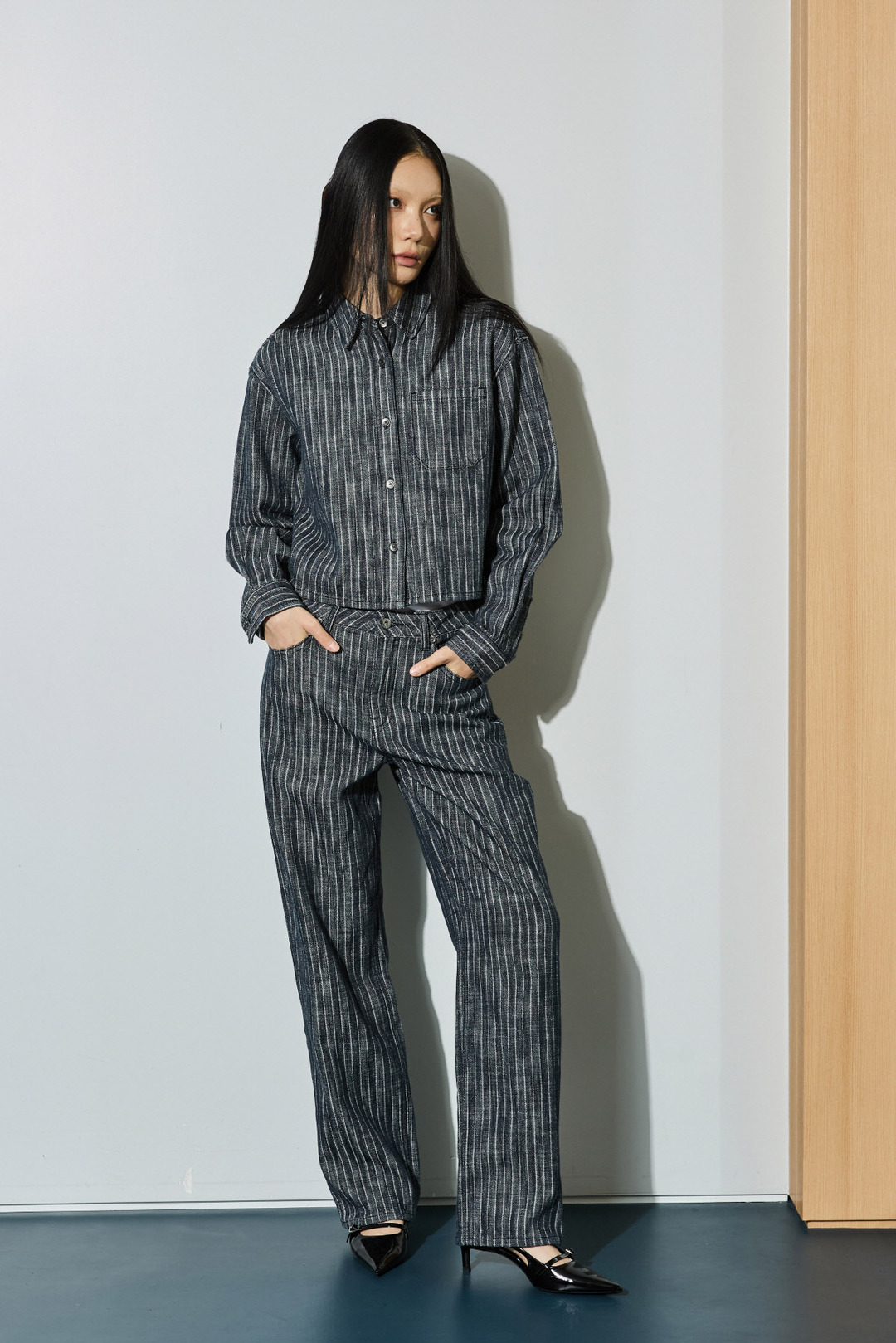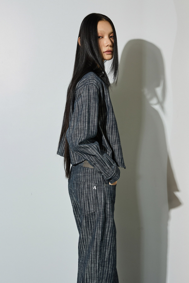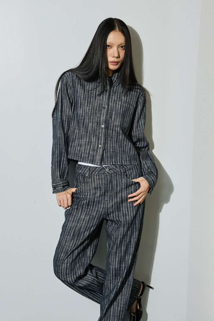 스트라이프 스트레이트 데님 팬츠와 셋업으로 함께 코디하여 연출하기 좋은 데님팬츠
