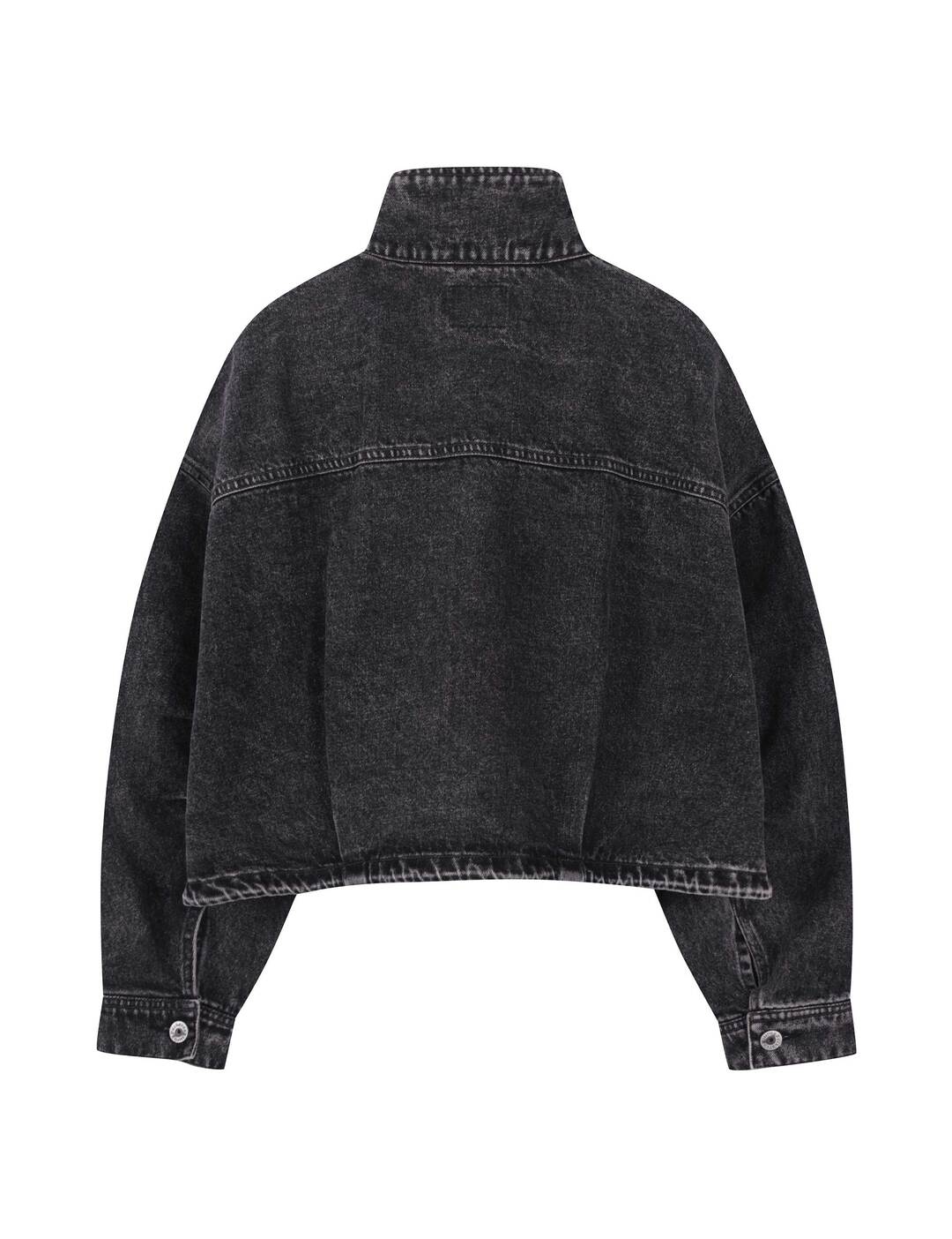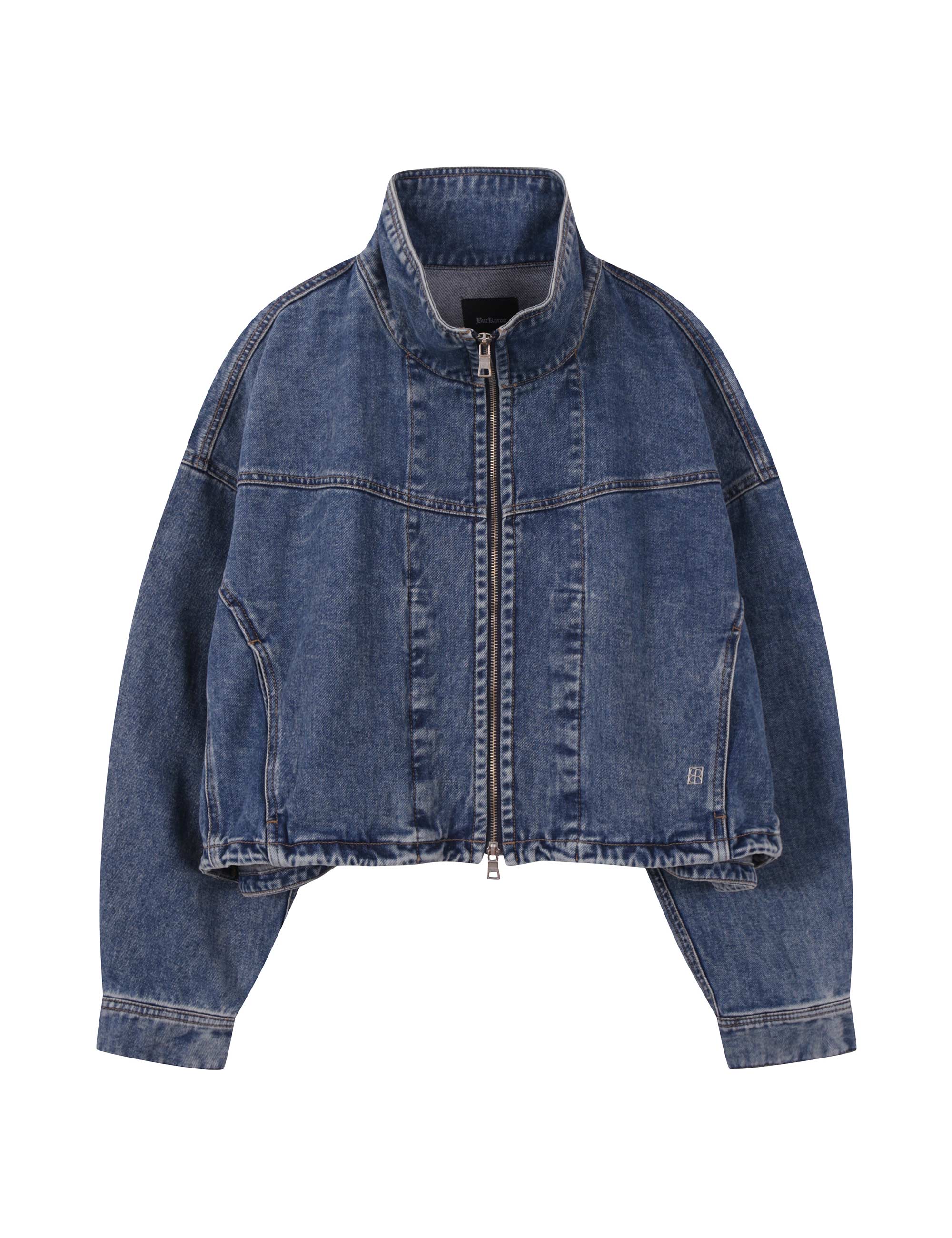 트렌디한 하이넥 디자인과 크롭 실루엣이 돋보이는 여성용 데님 집업 자켓