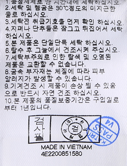 | 세탁방법 및 취급시 주의사항 | 본 제품은 손세탁 하십시오.(케어라벨참고) |