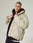 가볍고 소프트한 터치감의 폴리 와샤 원단 백면에 투명 필름지 처리를해 적당한 고시감과 다운리스를 최소화한 원단 사용.