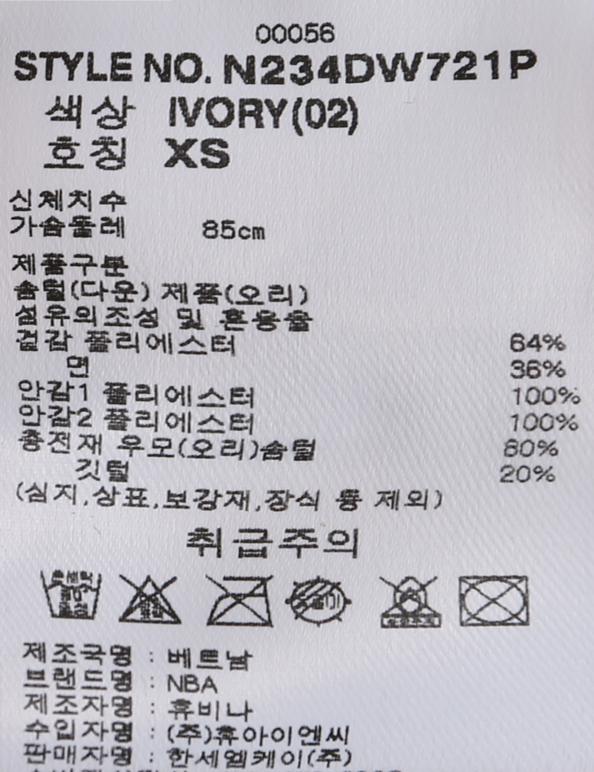 제품소재 [겉감]폴리에스터64% 면36% [안감1]폴리에스터100% [안감2]폴리에스터100% [충전재]우모(오리)솜털80% 깃털20%