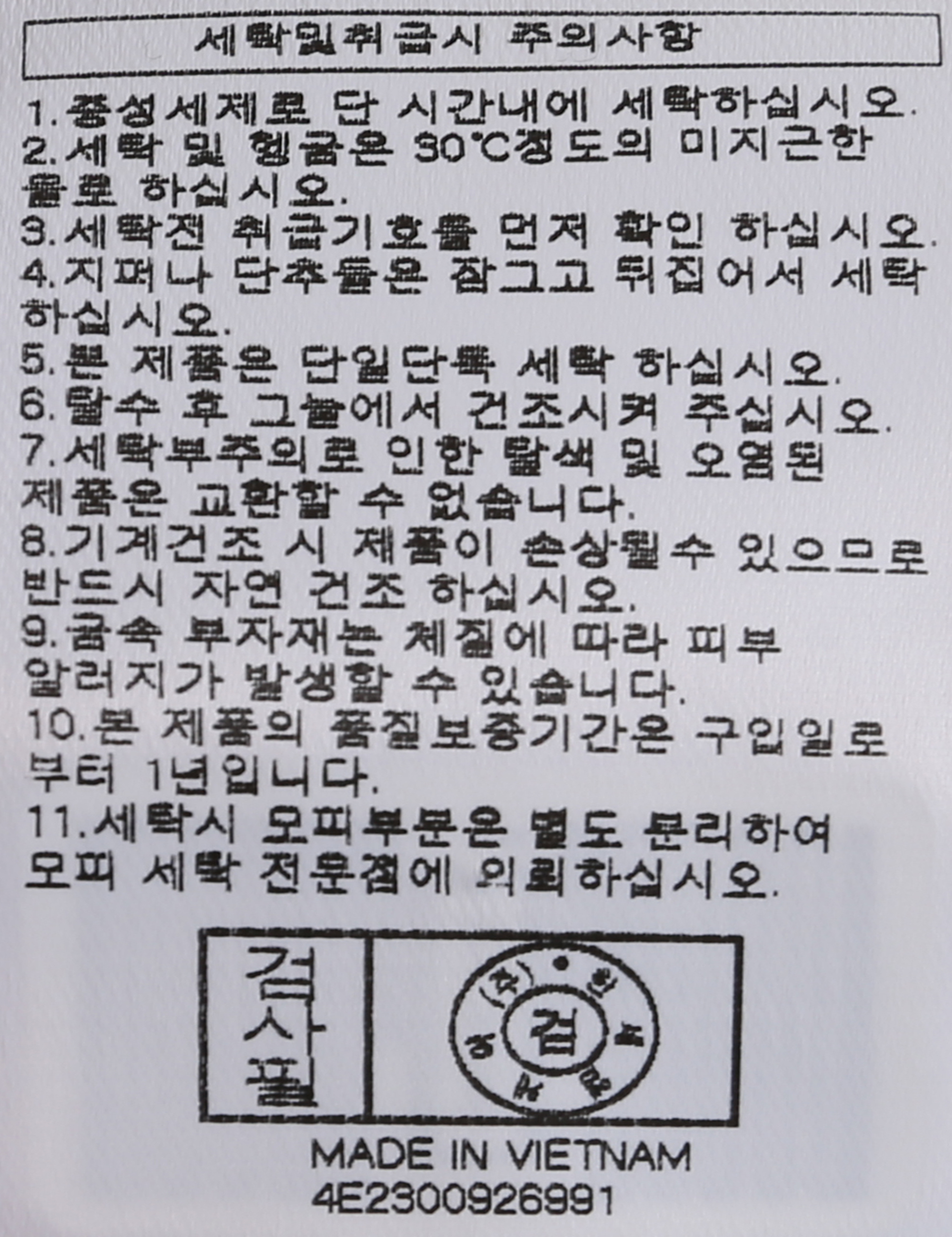 세탁방법 및 취급시 주의사항 본 제품은 손세탁 하십시오.(케어라벨참고)