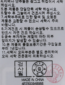 | 세탁방법 및 취급시 주의사항 | 중성세제로 단 시간내에 세탁하십시오.(케어라벨참고) |
