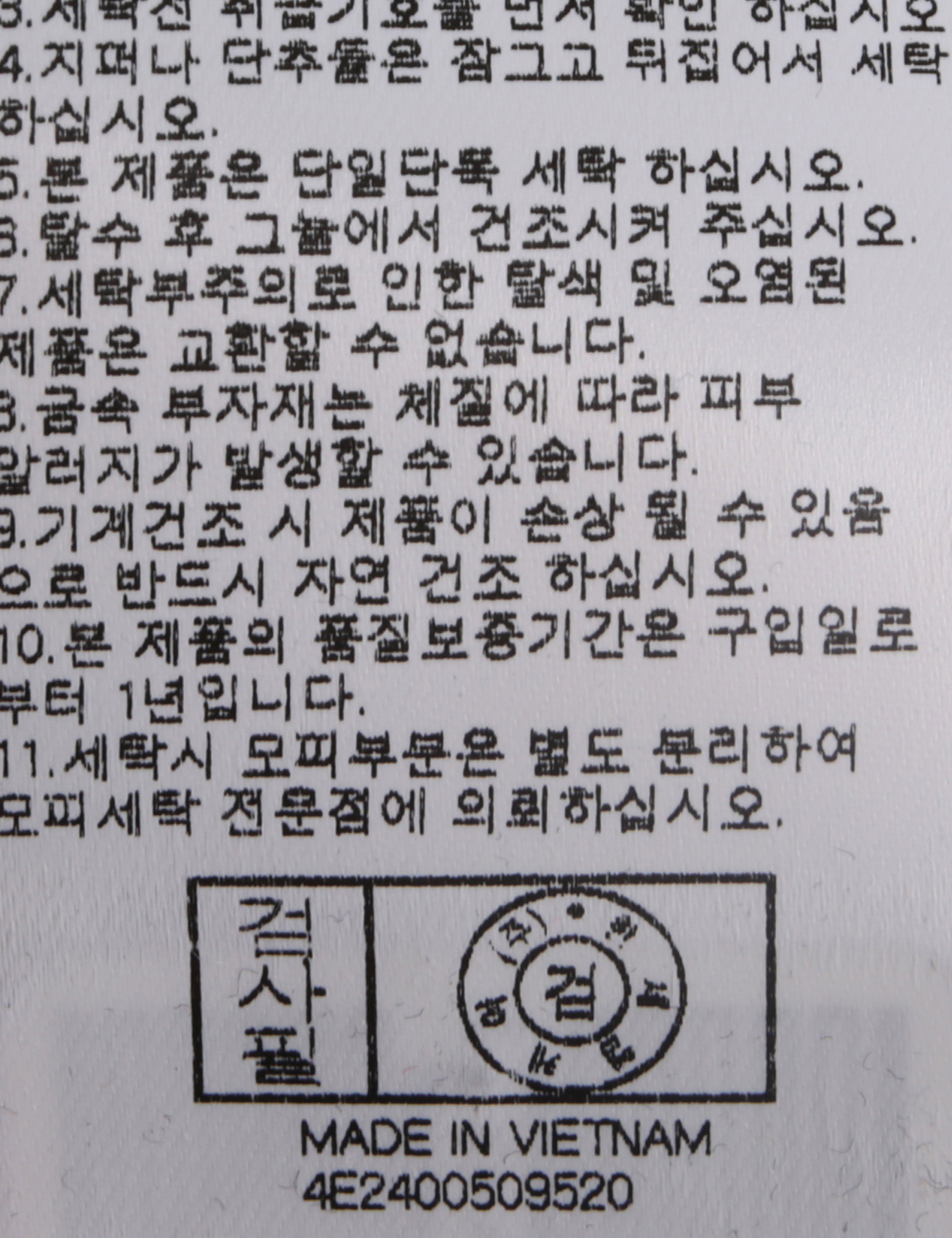 | 세탁방법 및 취급시 주의사항 | 본 제품은 손세탁 하십시오.(케어라벨참고) |