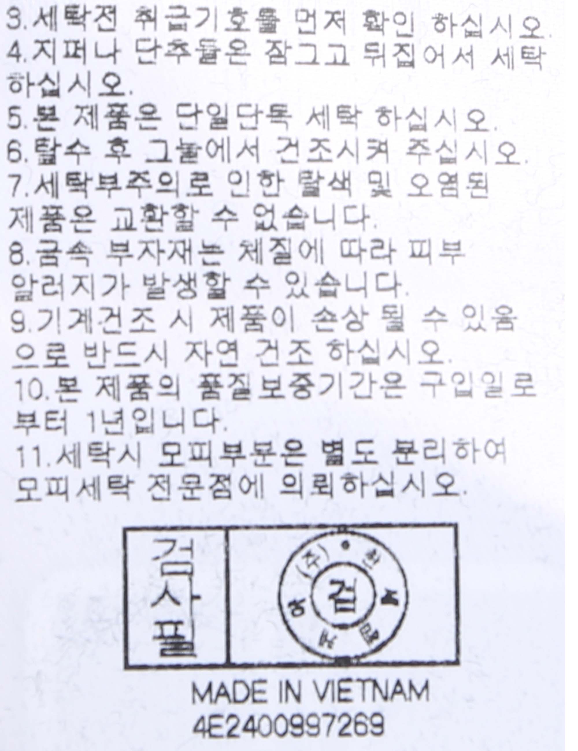 | 세탁방법 및 취급시 주의사항 | 본 제품은 손세탁 하십시오.(케어라벨참고) |