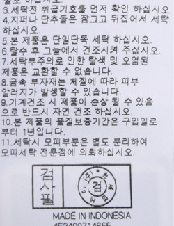 | 세탁방법 및 취급시 주의사항 | 본 제품은 손세탁 하십시오.(케어라벨참고) |