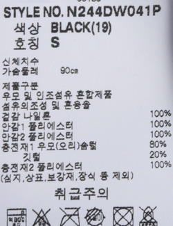 브랜드 홈 바로가기| 제품소재 | [겉감]나일론100% [안감1]폴리에스터100% [안감2]폴리에스터100% [충전재1]우모(오리)솜털80% 깃털20% [충전재2]폴리에스터100% |