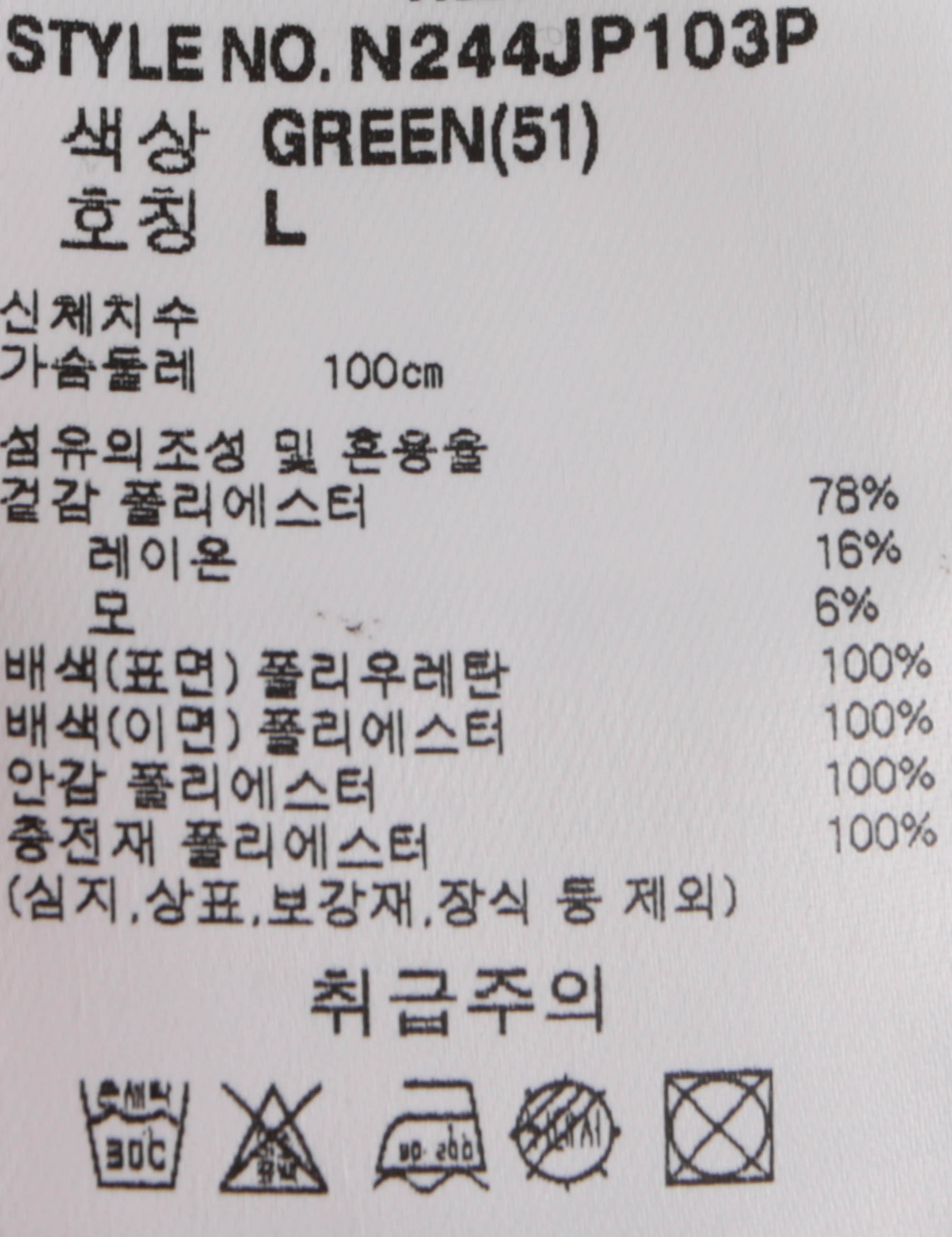 브랜드 홈 바로가기| 제품소재 | [겉감]폴리에스터78% 레이온16% 모6% [배색표면]폴리우레탄100% [배색이면]폴리에스터100% [안감]폴리에스터100% [충전재]폴리에스터100% |