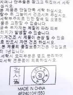 | 세탁방법 및 취급시 주의사항 | 본 제품은 손세탁 하십시오.(케어라벨참고) |
