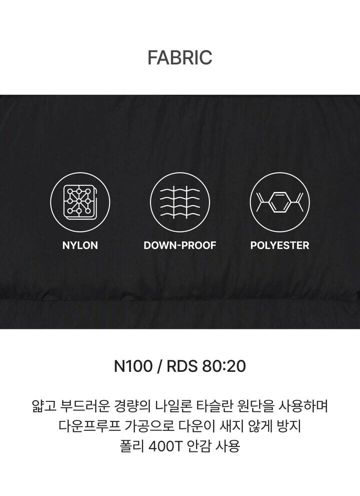 브랜드 홈 바로가기| 제품소재 | [겉감]나일론100% [안감1]폴리에스터100% [안감2]폴리에스터100% [충전재1]우모(오리)솜털80% 깃털20% [충전재2]폴리에스터100% |