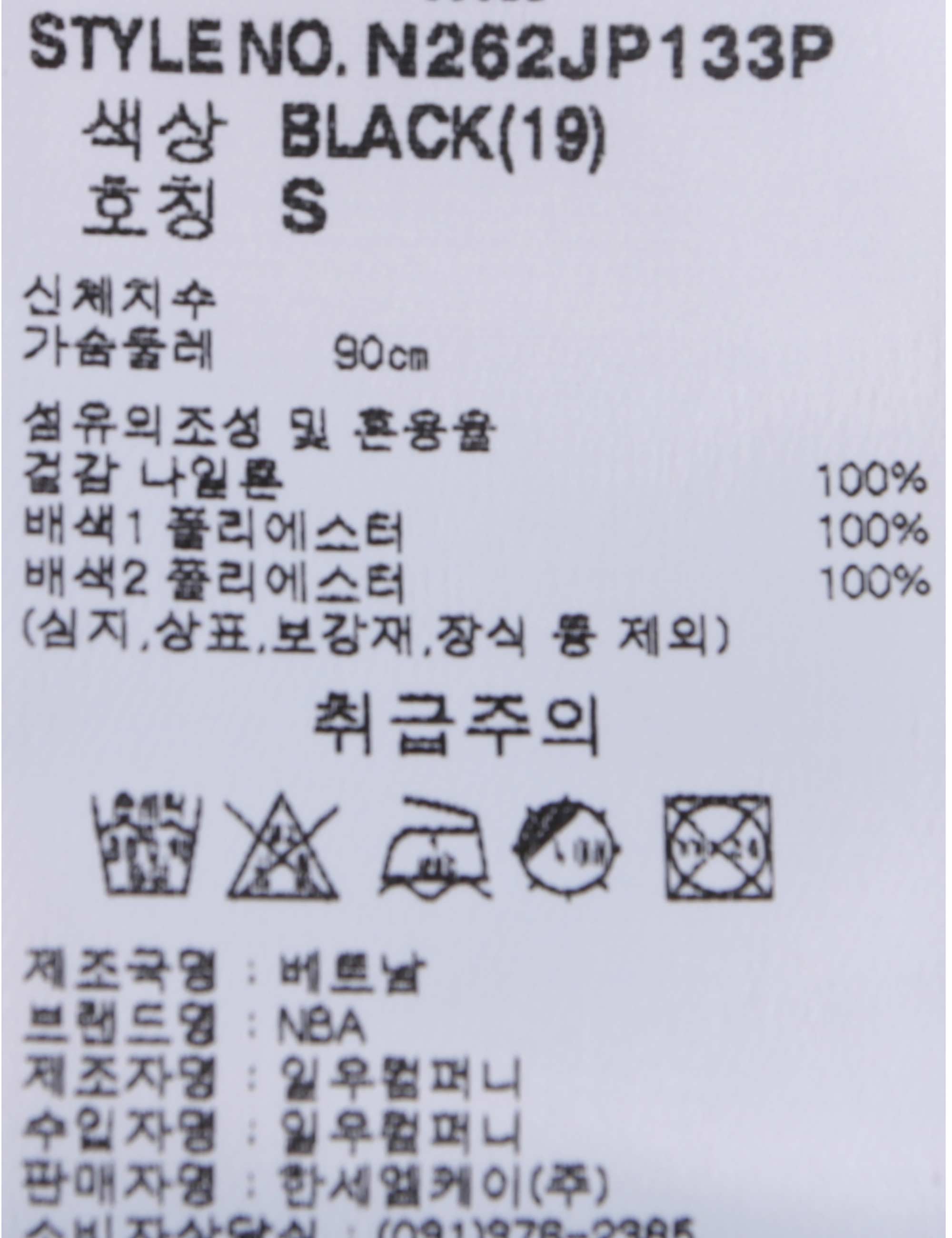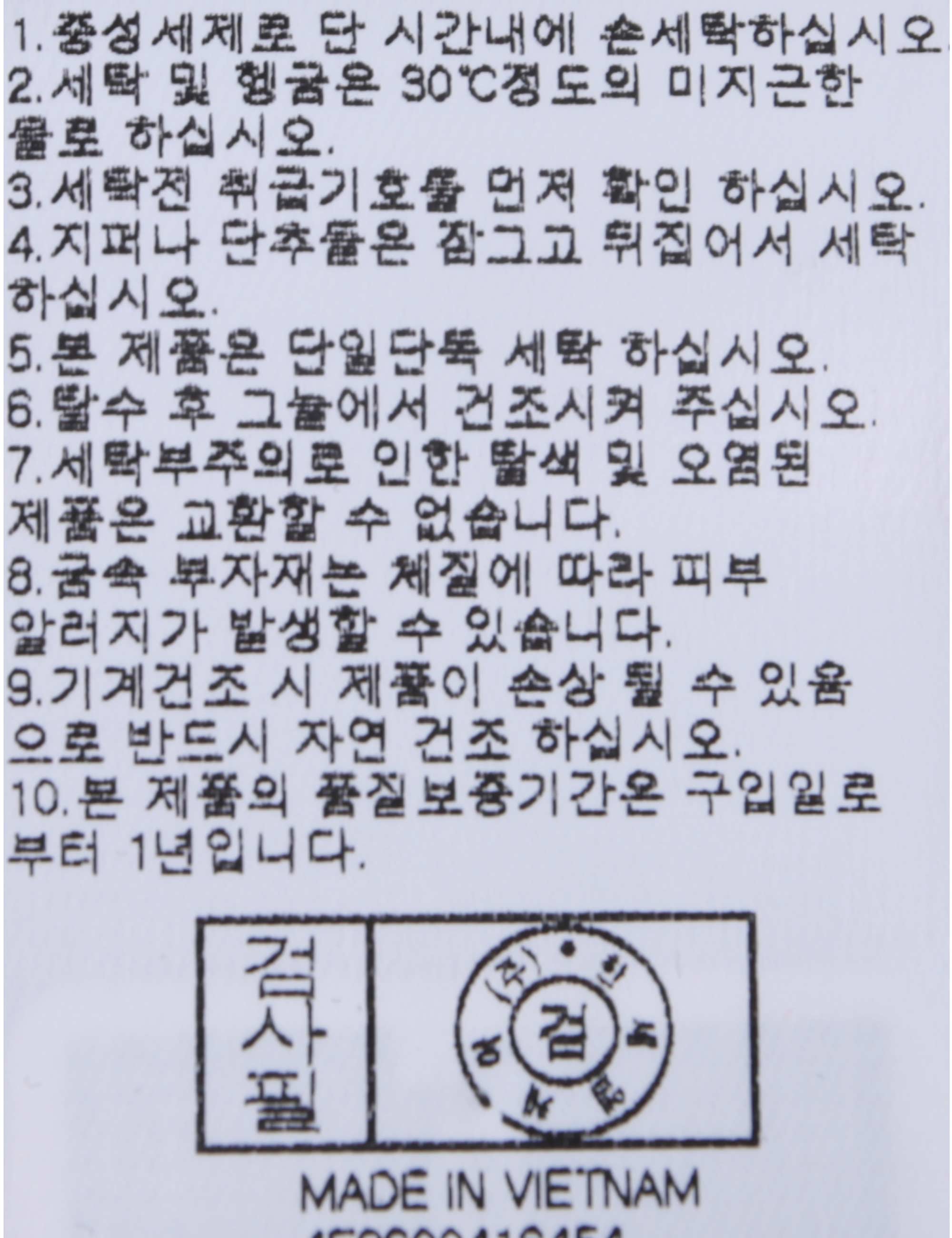 | 세탁방법 및 취급시 주의사항 | 본 제품은 손세탁 하십시오.(케어라벨참고) |