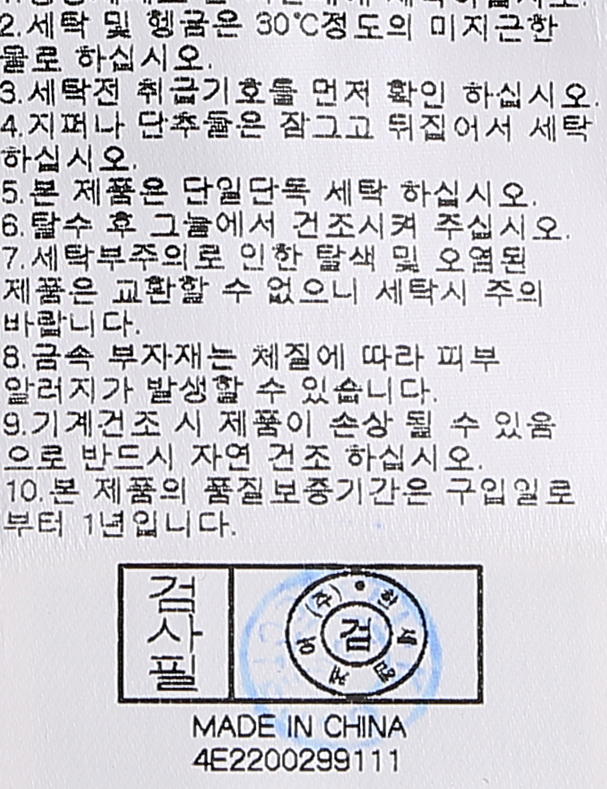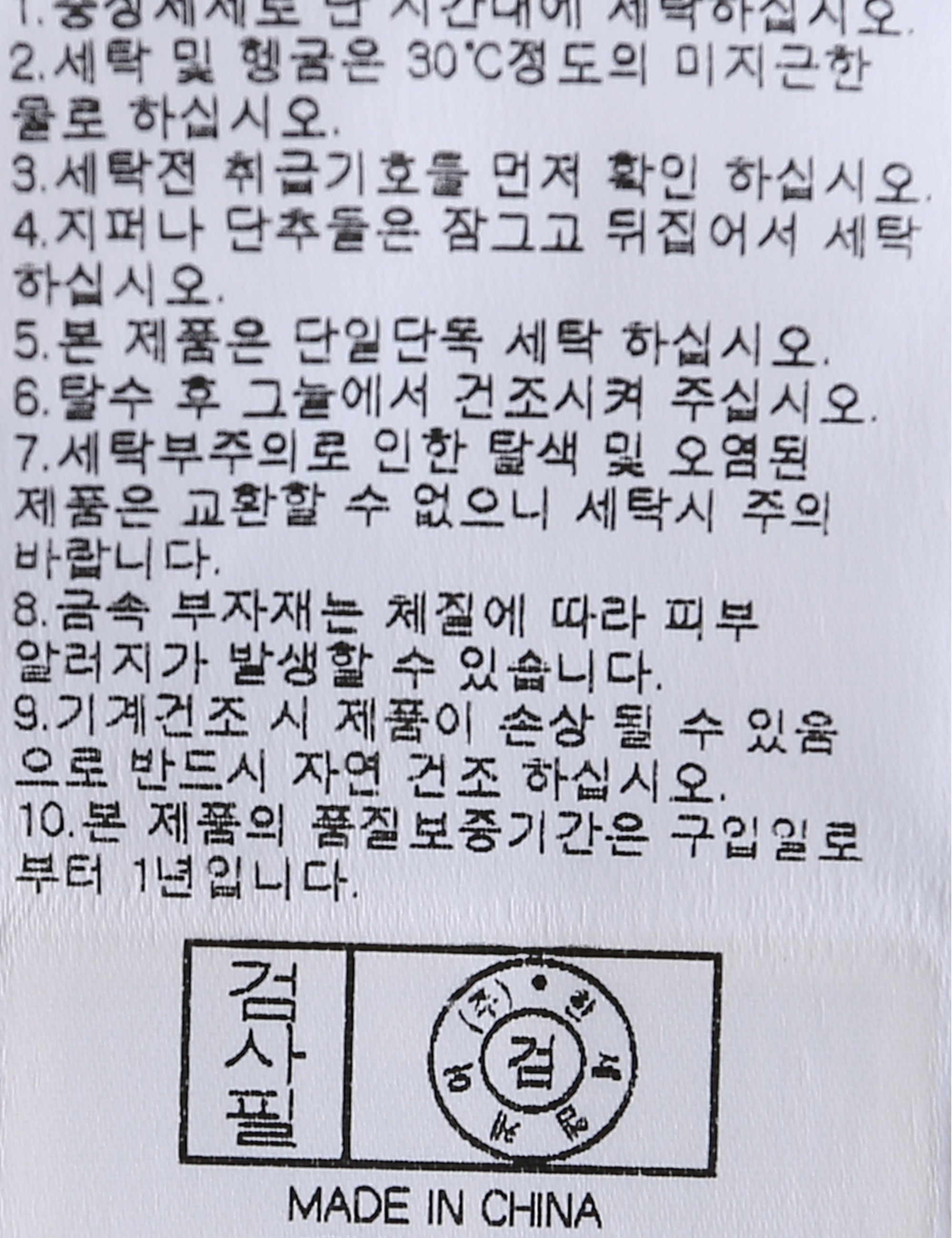 | 세탁방법 및 취급시 주의사항 | 중성세제로 단 시간내에 세탁하십시오.(케어라벨참고) |