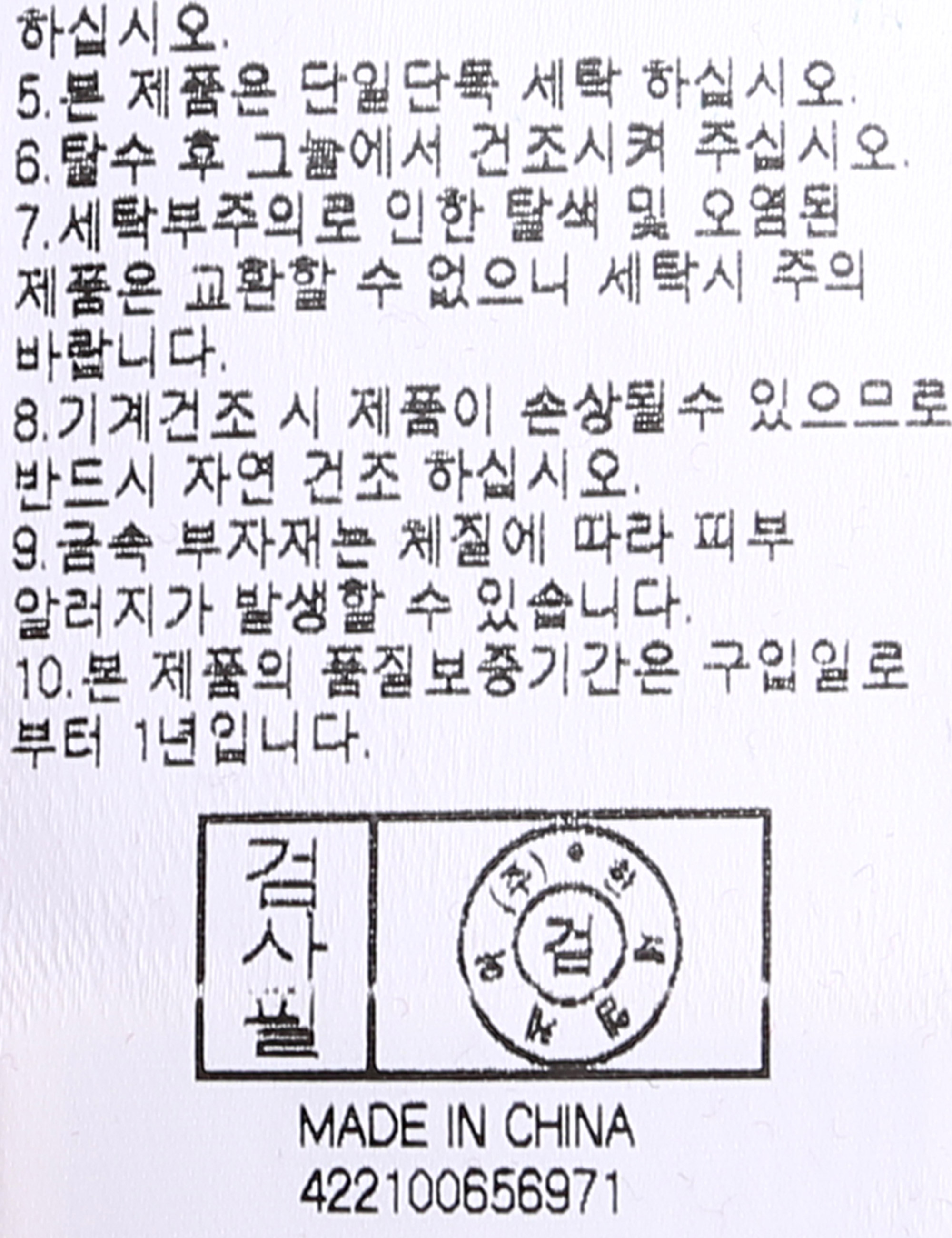 | 세탁방법 및 취급시 주의사항 | 중성세제로 단 시간내에 세탁하십시오.(케어라벨참고) |