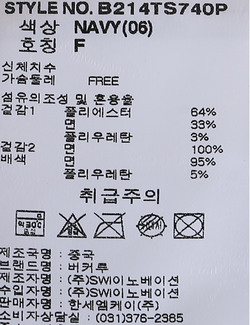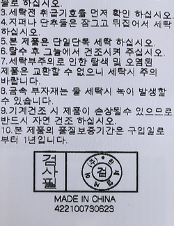 | 세탁방법 및 취급시 주의사항 | 중성세제로 단 시간내에 세탁하십시오.(케어라벨참고) |
