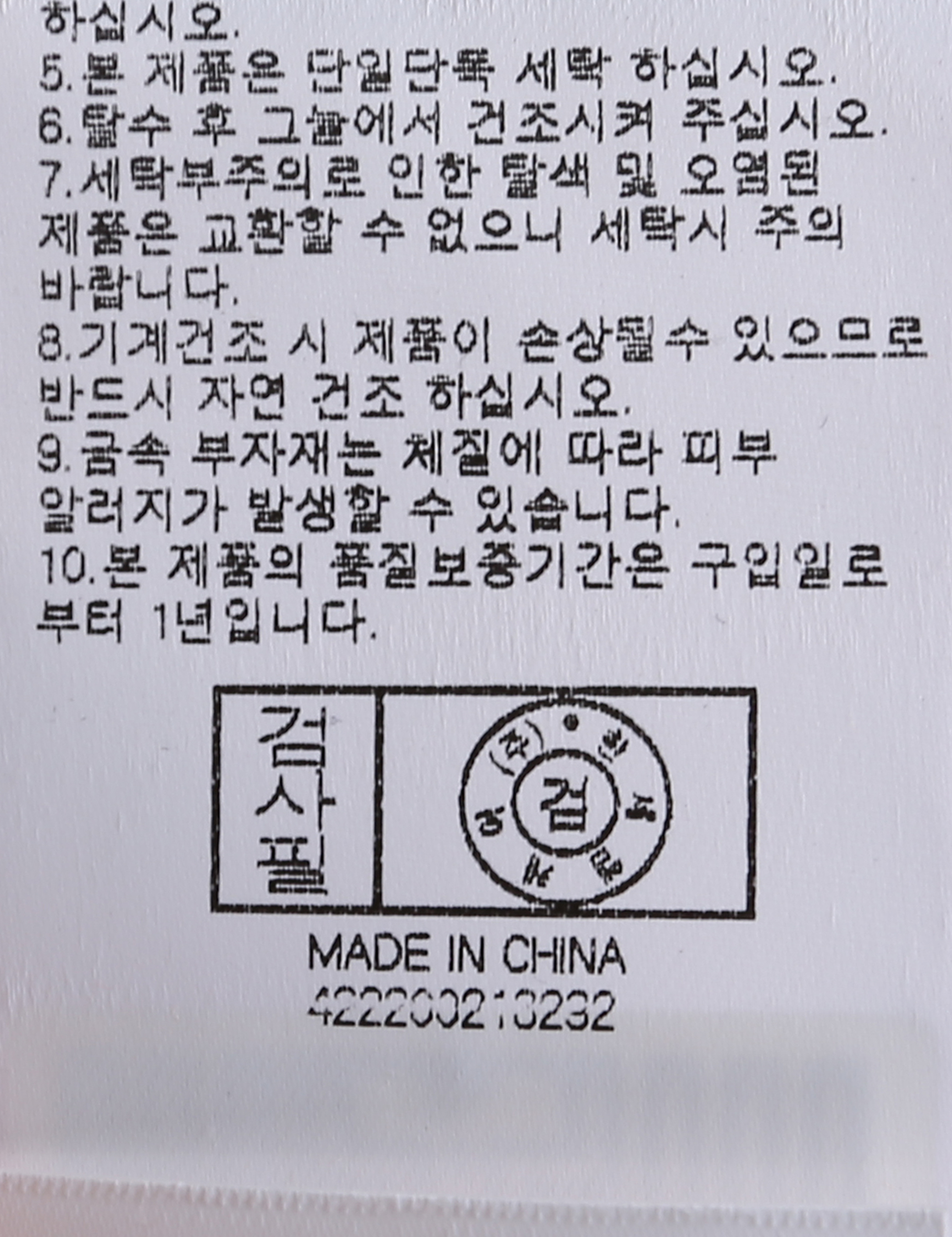 세탁방법 및 취급시 주의사항 중성세제로 단 시간내에 세탁하십시오.(케어라벨참고)