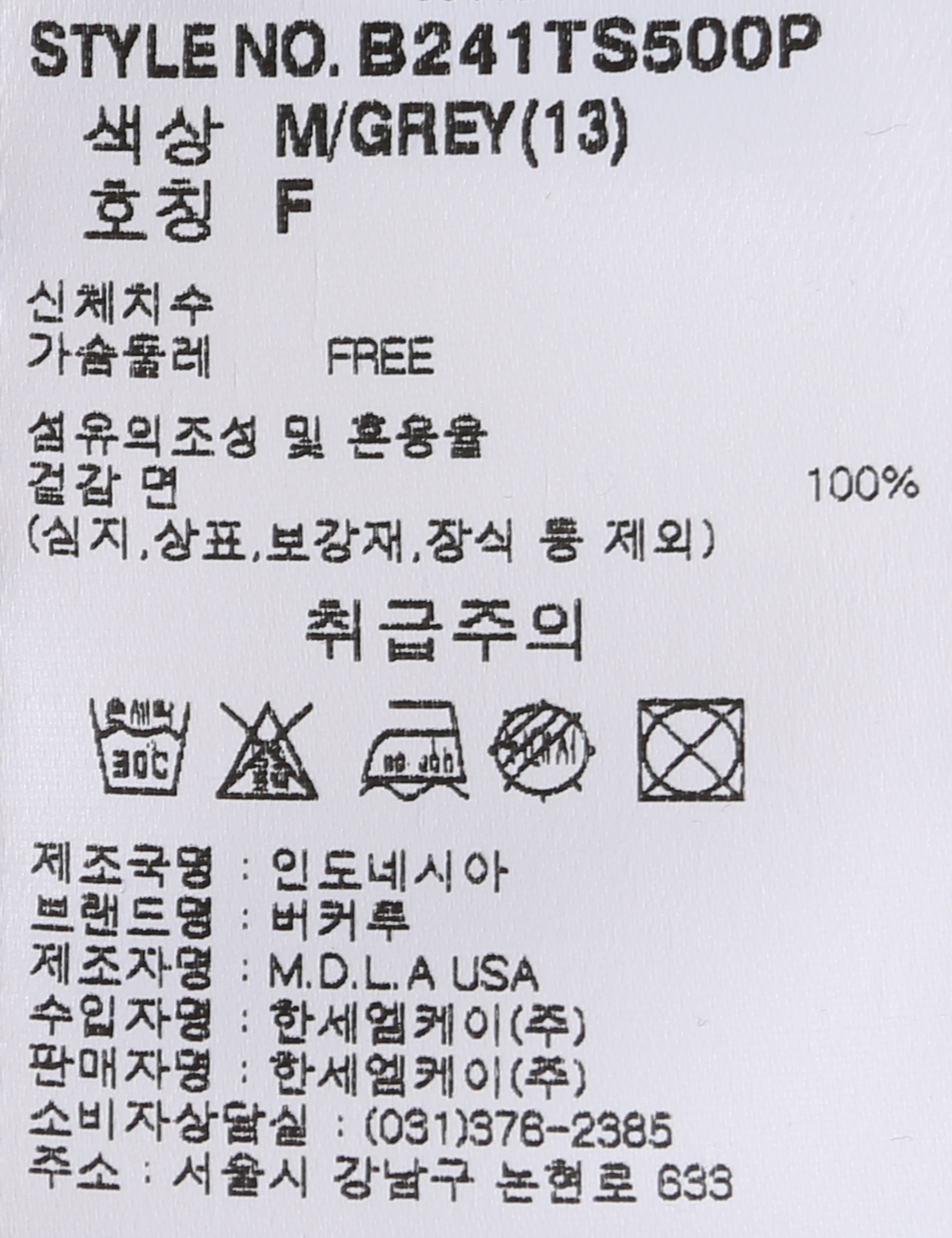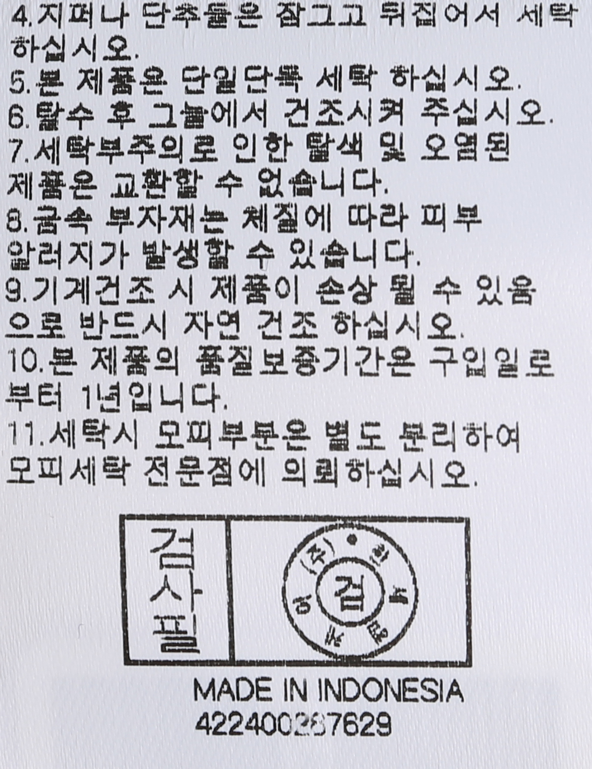 | 세탁방법 및 취급시 주의사항 | 본 제품은 손세탁 하십시오.(케어라벨참고) |