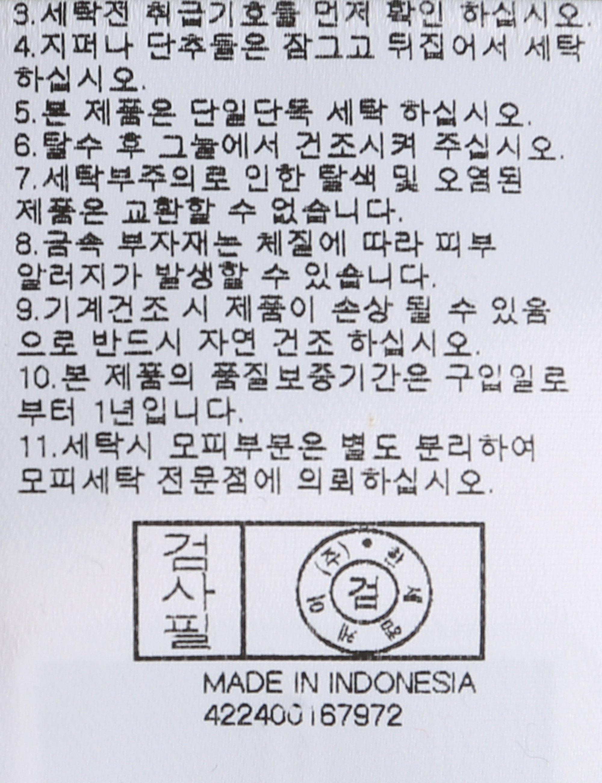 | 세탁방법 및 취급시 주의사항 | 본 제품은 손세탁 하십시오.(케어라벨참고) |