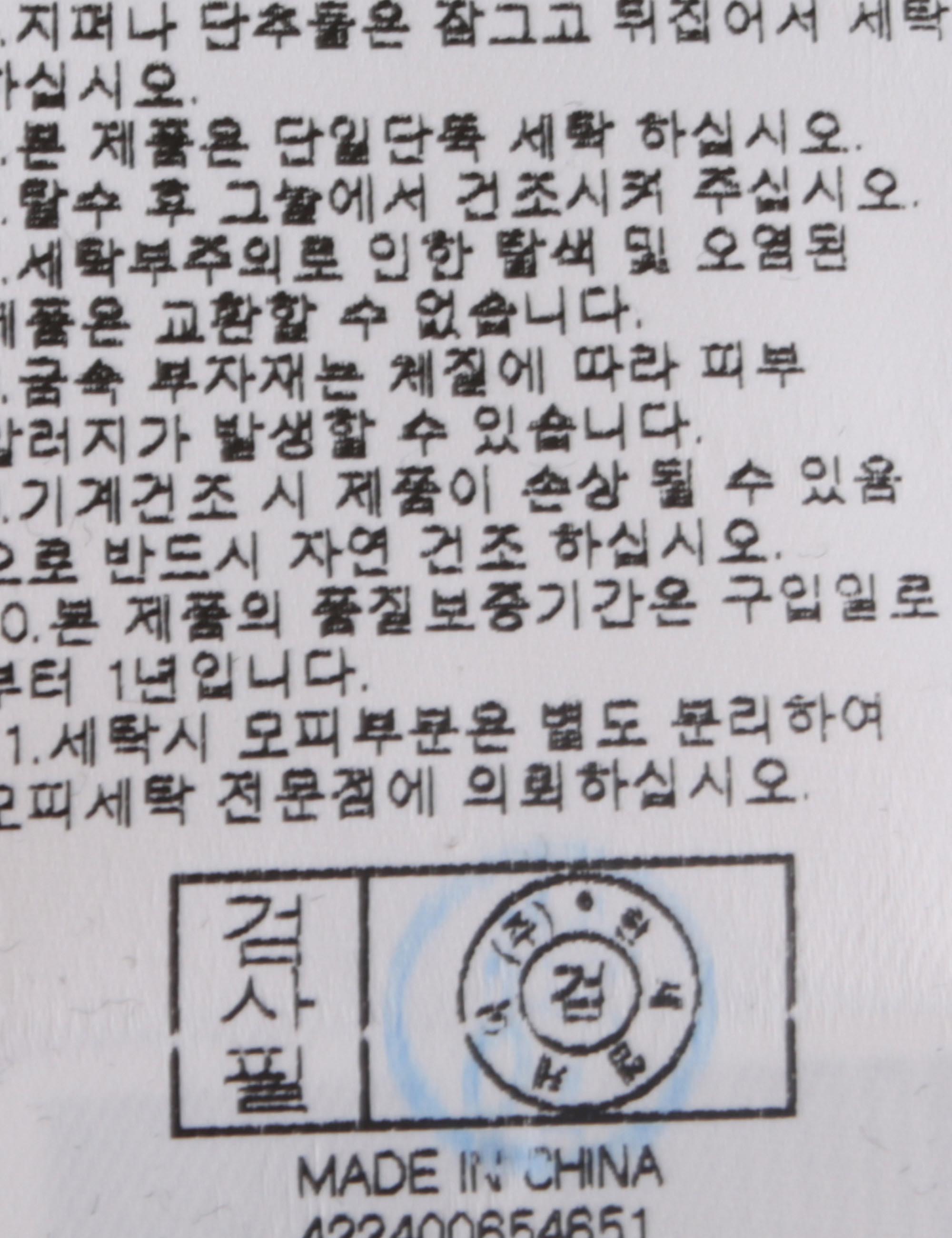 | 세탁방법 및 취급시 주의사항 | 본 제품은 손세탁 하십시오.(케어라벨참고) |
