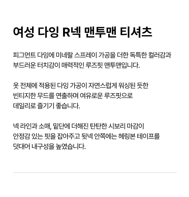 | 상품명 | 여성 다잉 R넥 맨투맨 티셔츠(B254TS520P) |