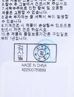 | 세탁방법 및 취급시 주의사항 | 본 제품은 손세탁 하십시오.(케어라벨참고) |