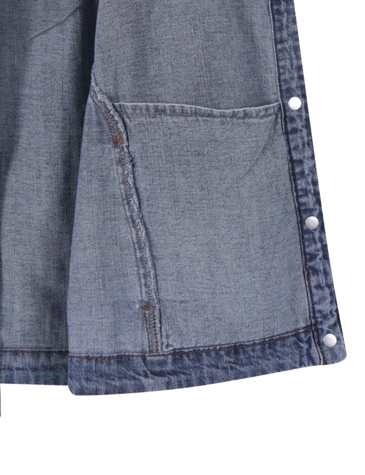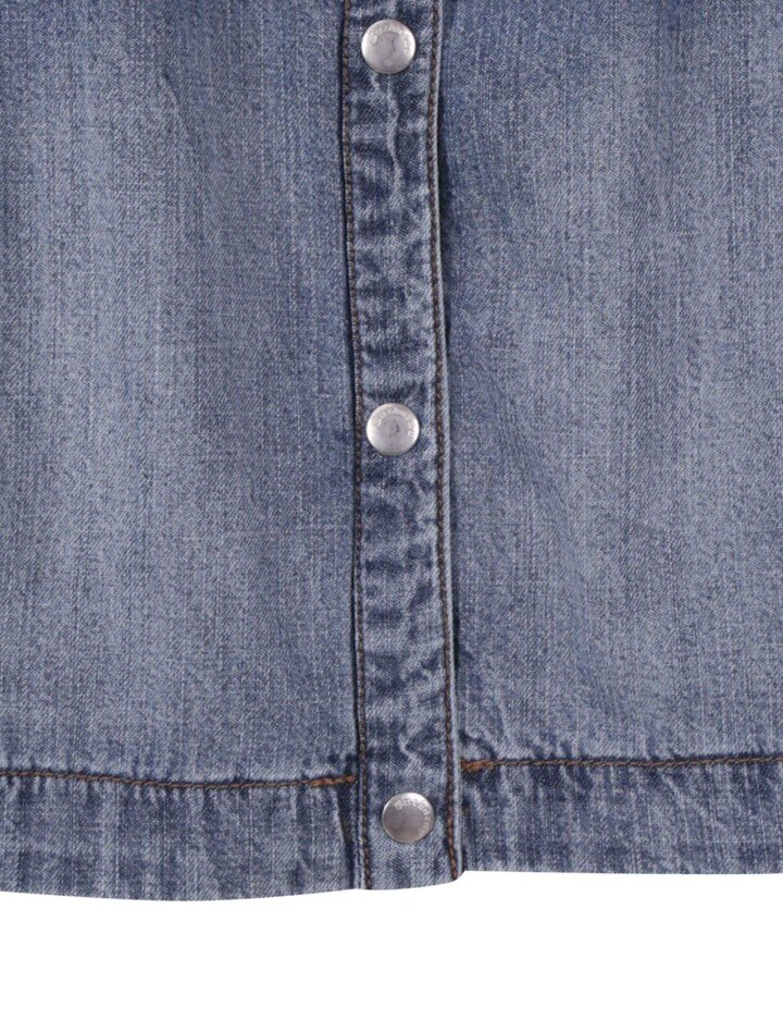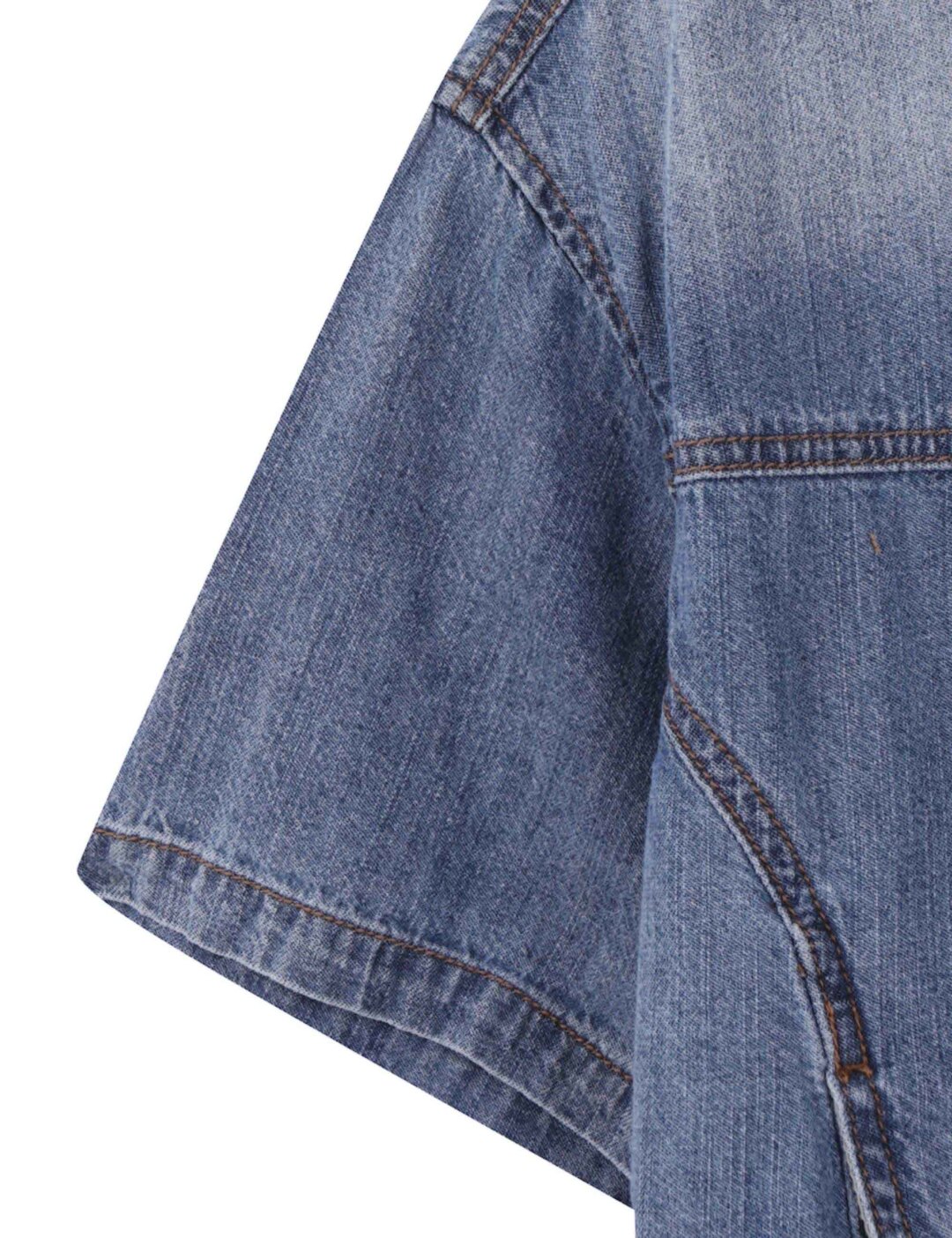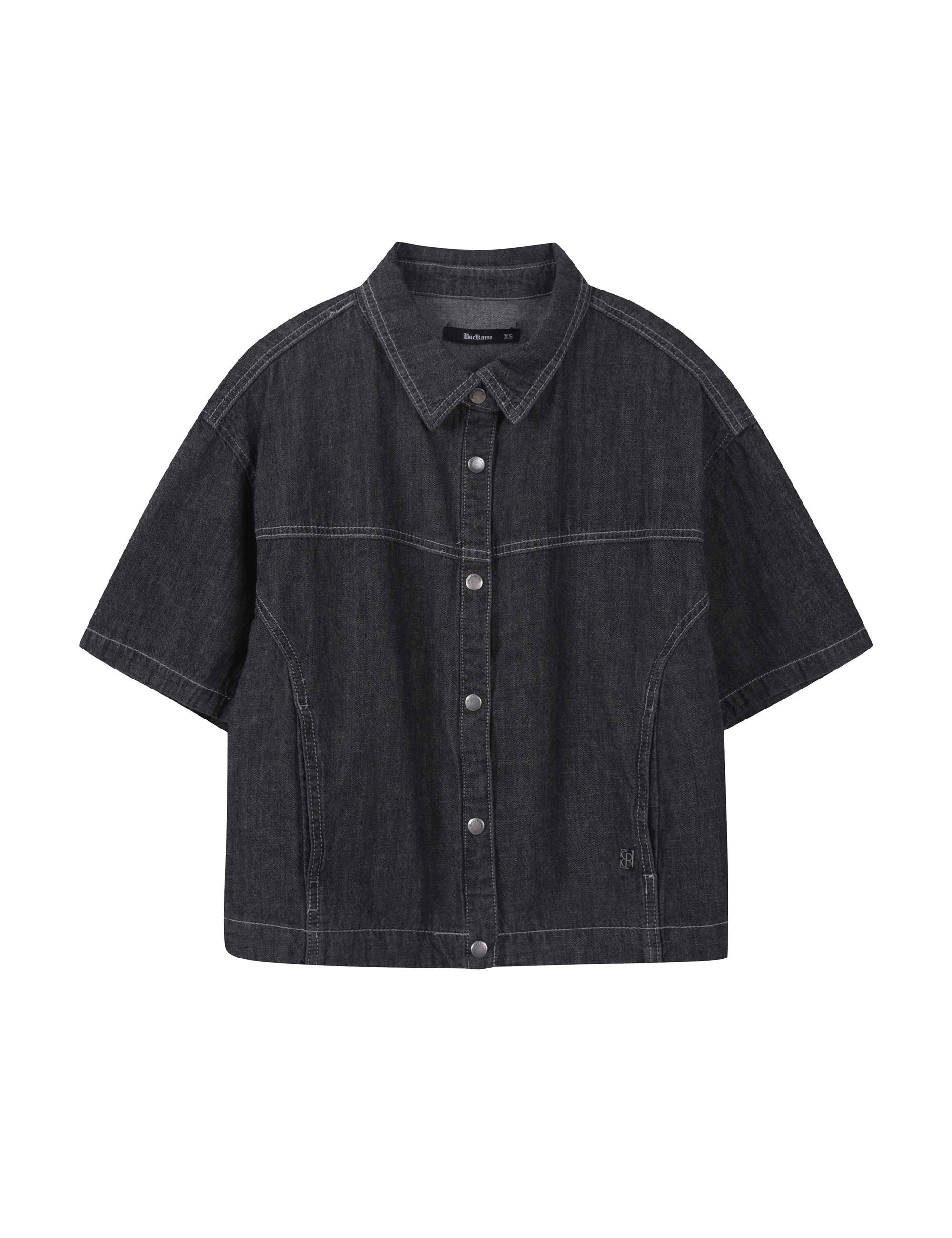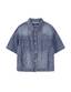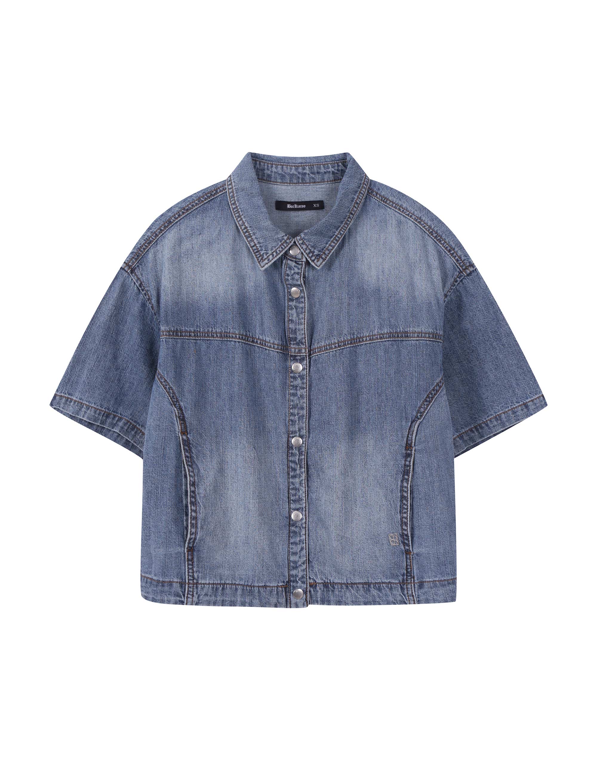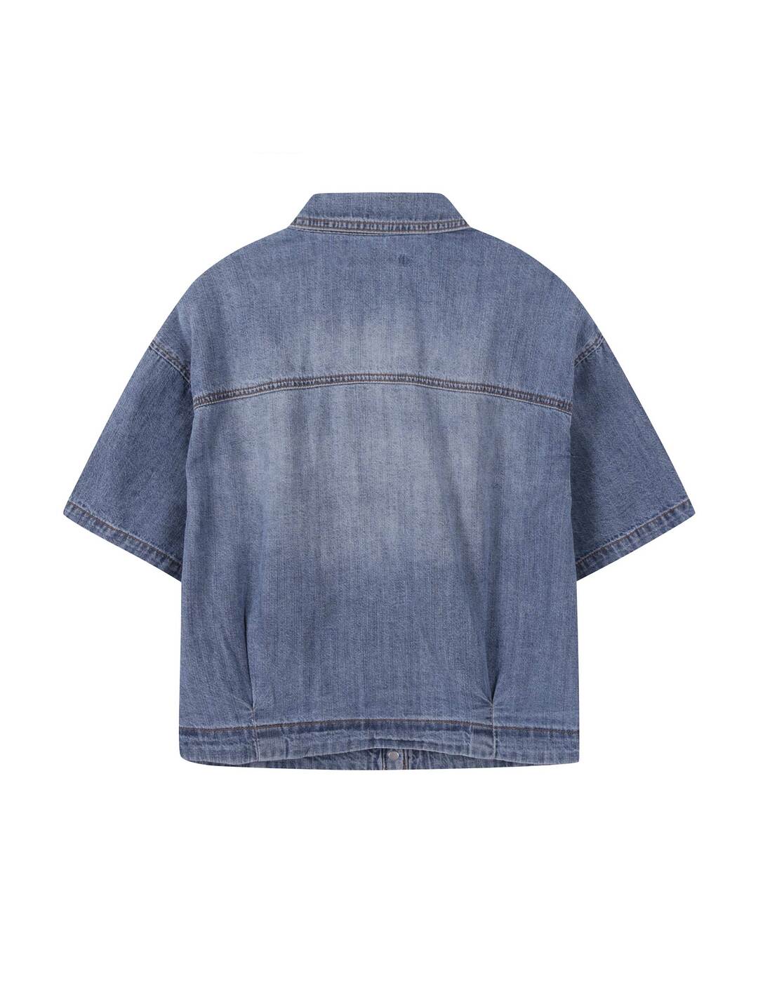 뒷판 턱 디테일과 핸드브러쉬 워싱으로 트렌디한 볼륨감을 살린 여성용 데님 크롭 반팔 셔츠
