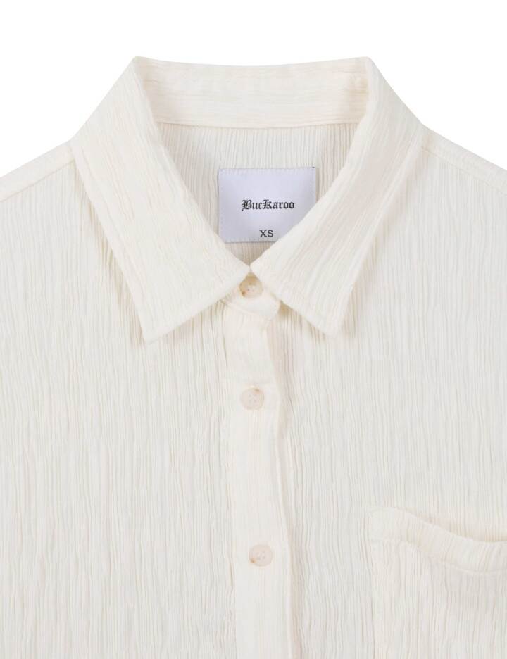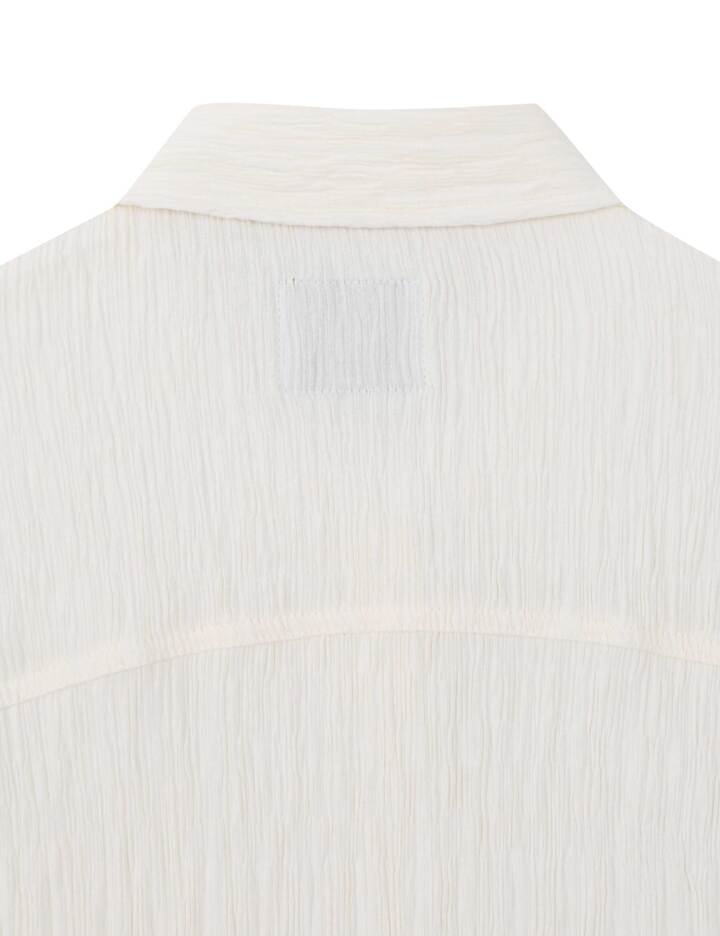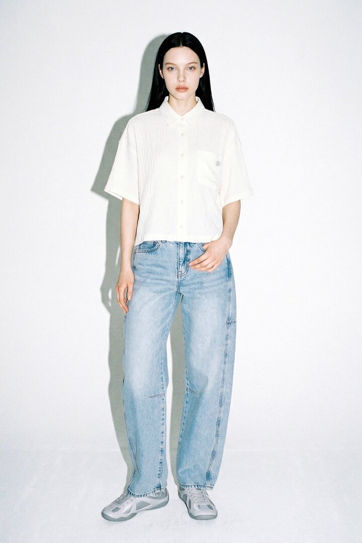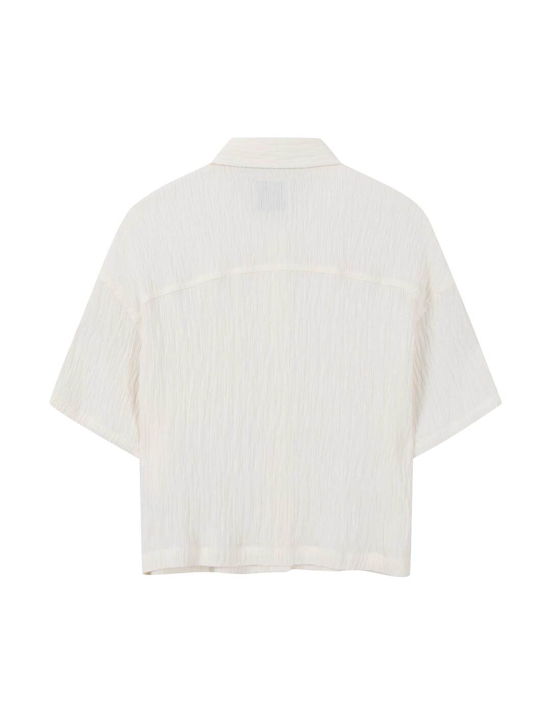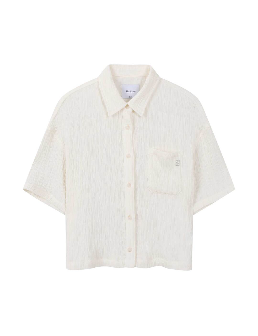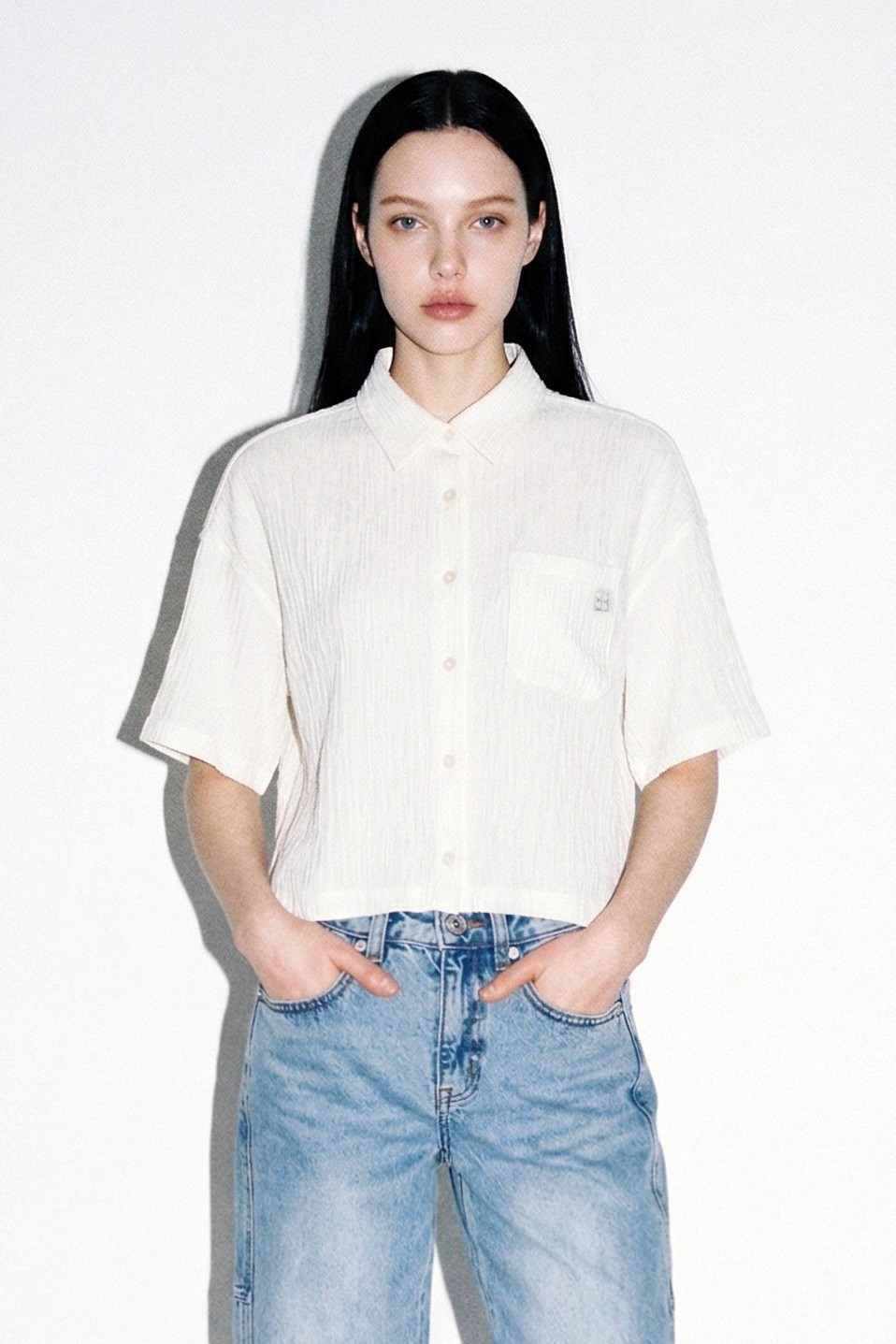 크링클 소재 특유의 내추럴한 텍스처로 여유로운 실루엣을 완성한 여성용 루즈핏 원포켓 반팔 셔츠