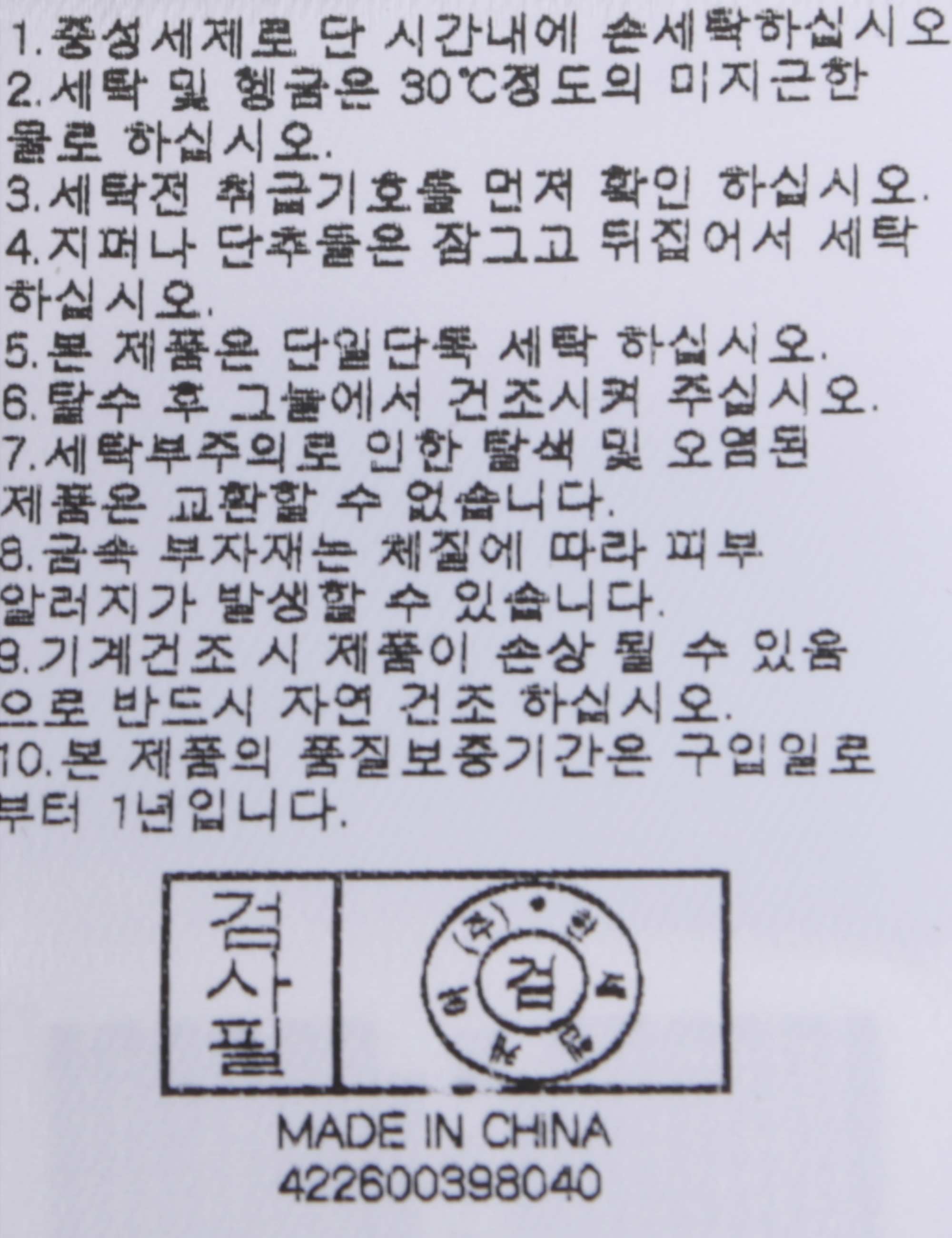 | 세탁방법 및 취급시 주의사항 | 본 제품은 손세탁 하십시오.(케어라벨참고) |