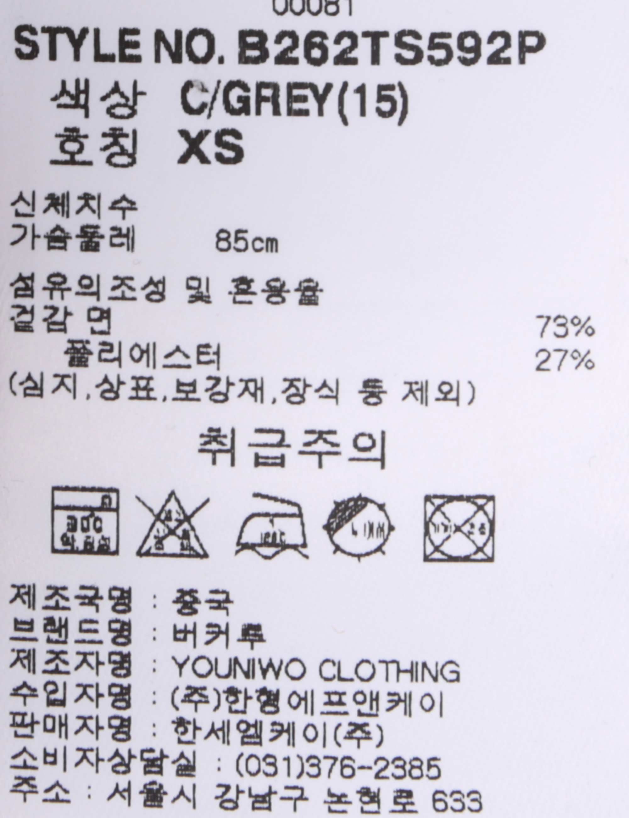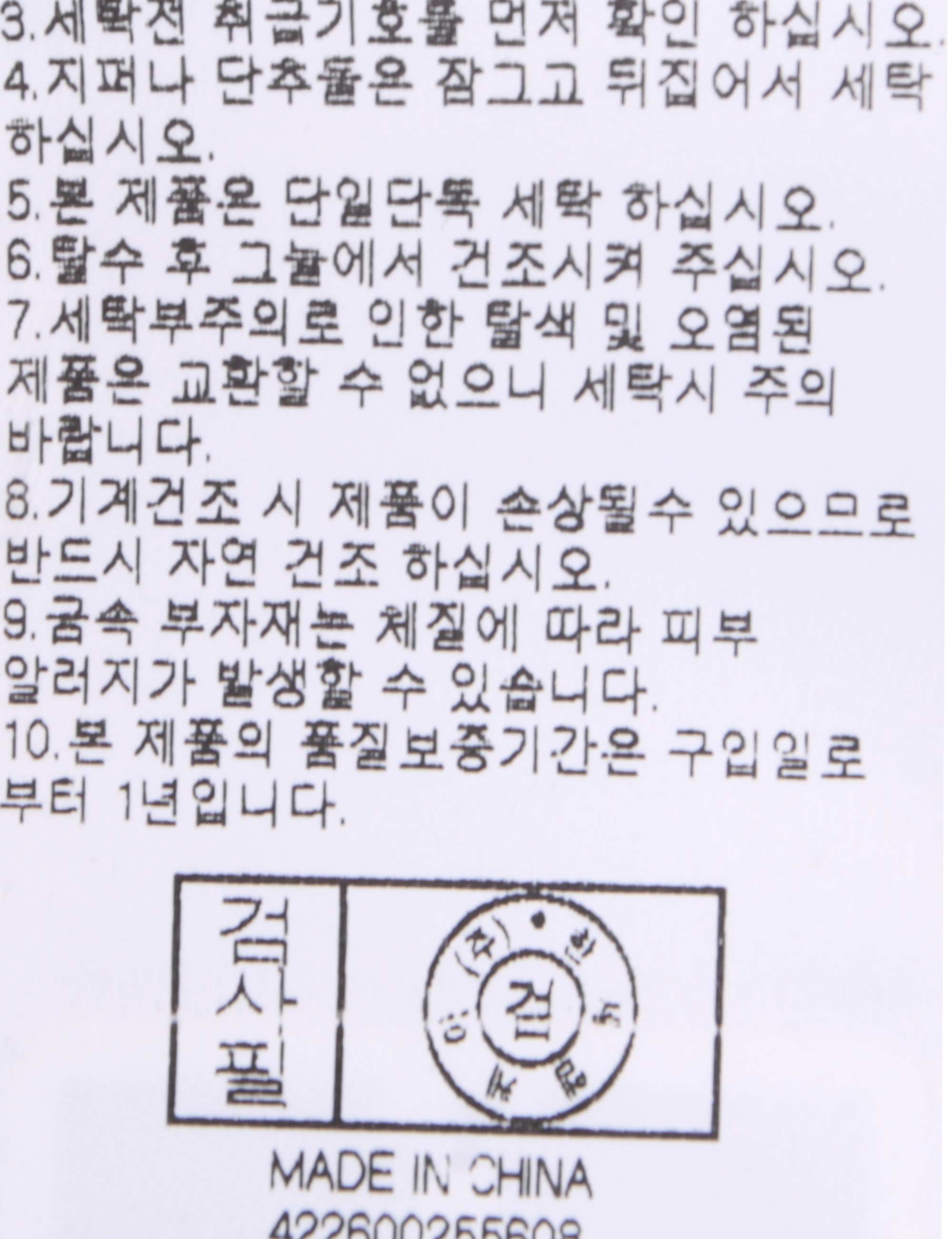 | 세탁방법 및 취급시 주의사항 | 중성세제로 단 시간내에 세탁하십시오.(케어라벨참고) |