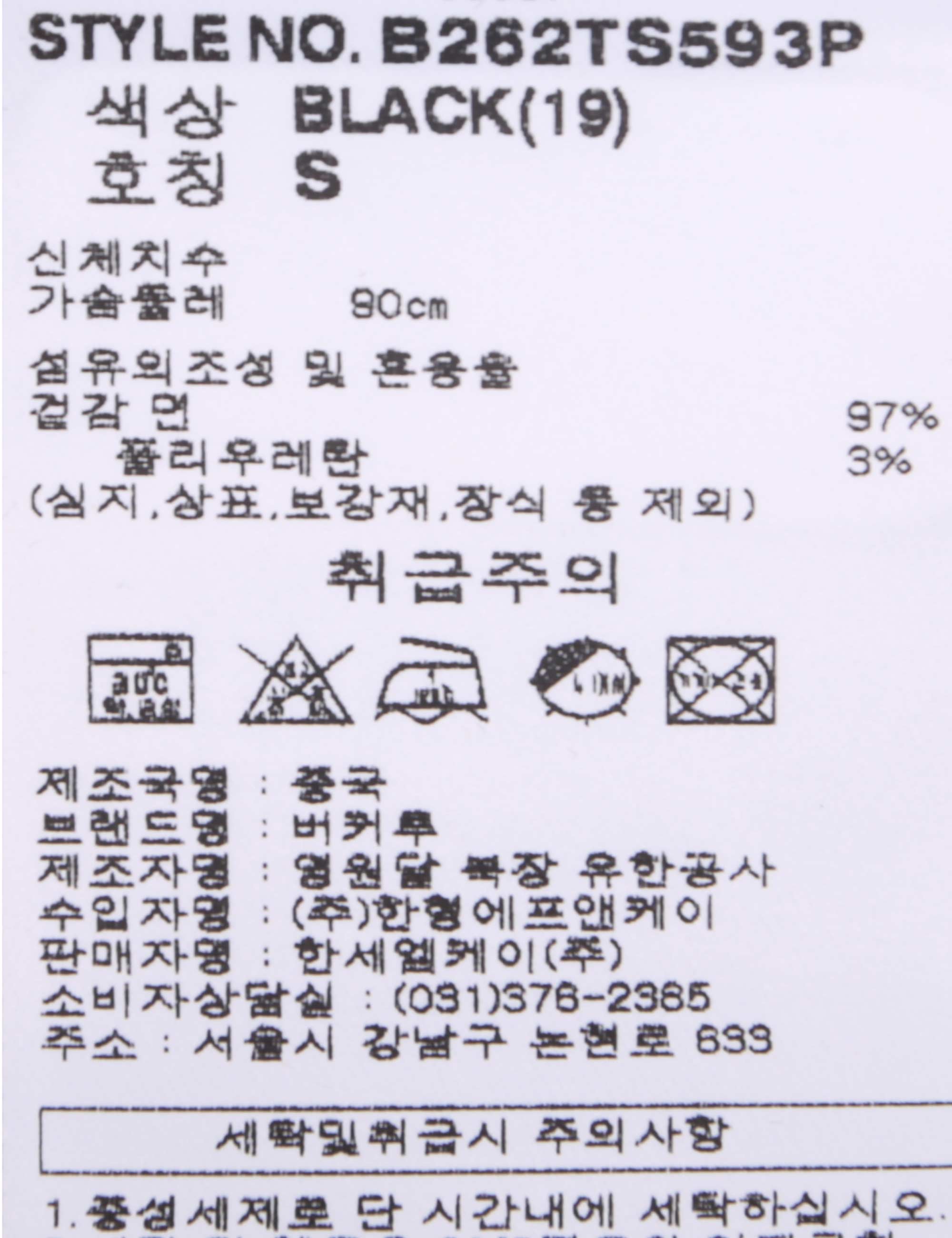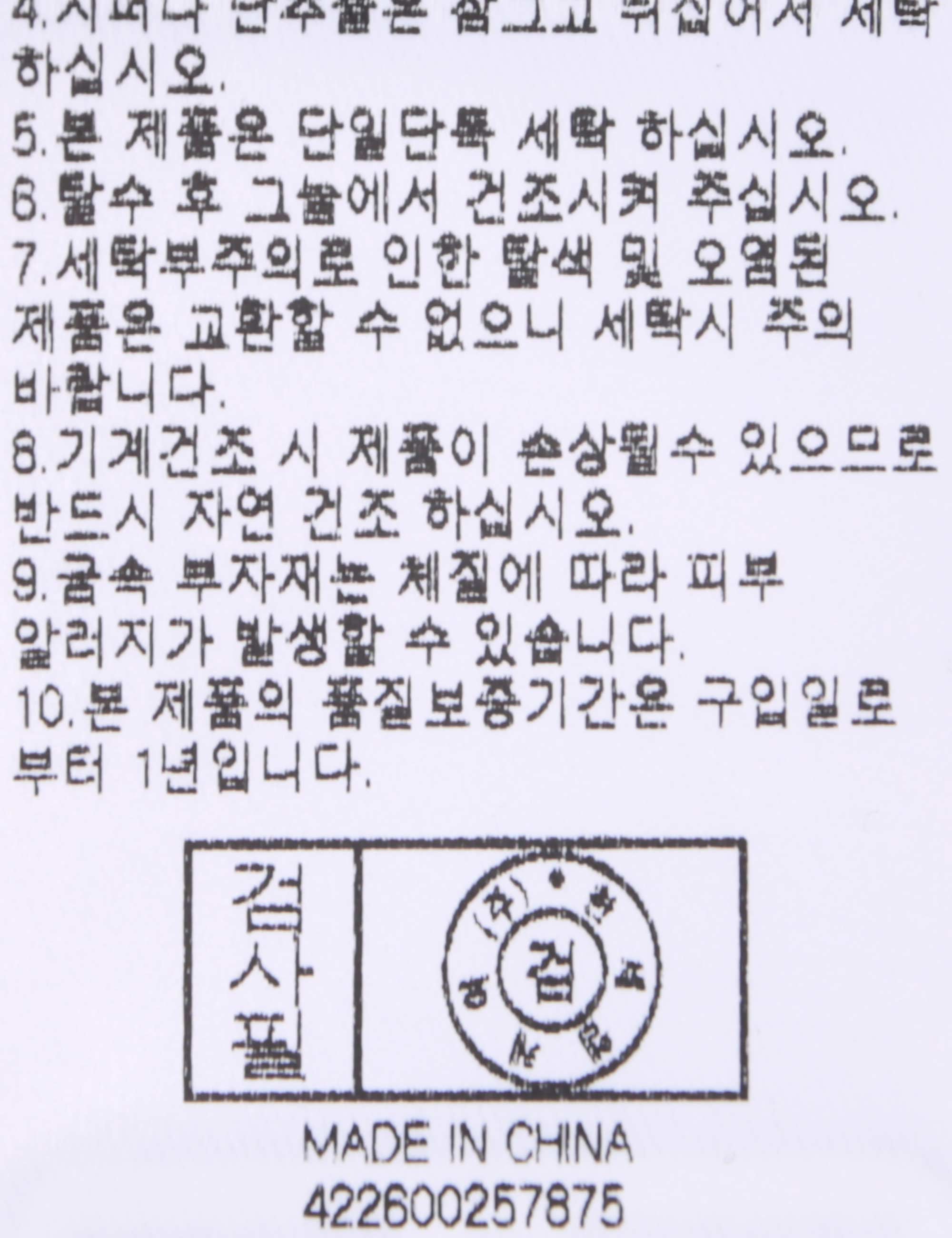 | 세탁방법 및 취급시 주의사항 | 중성세제로 단 시간내에 세탁하십시오.(케어라벨참고) |