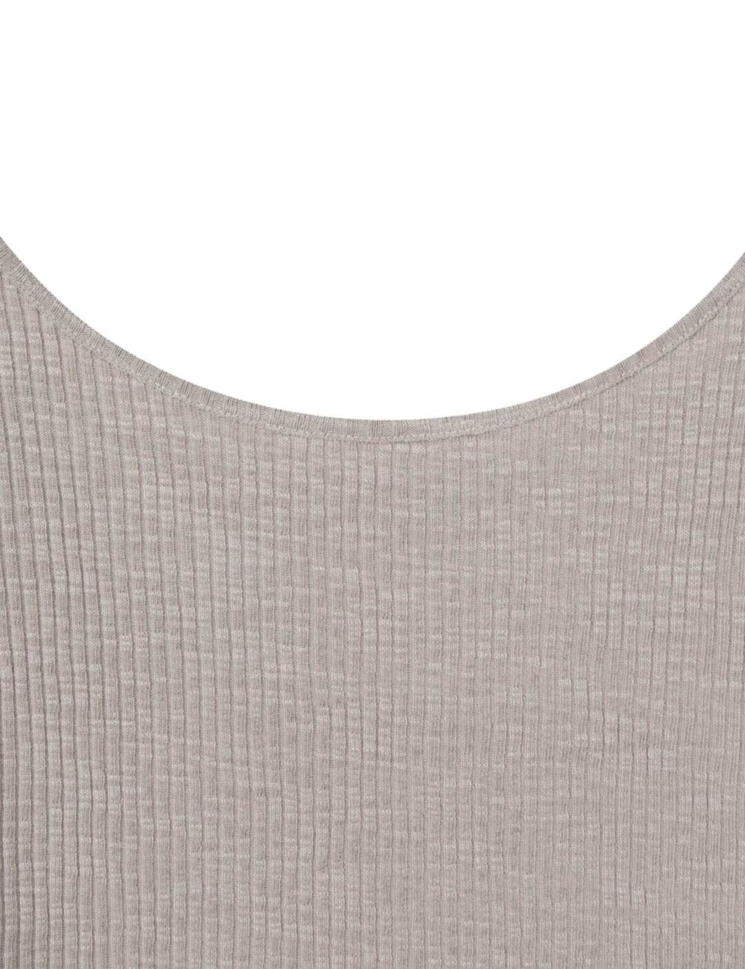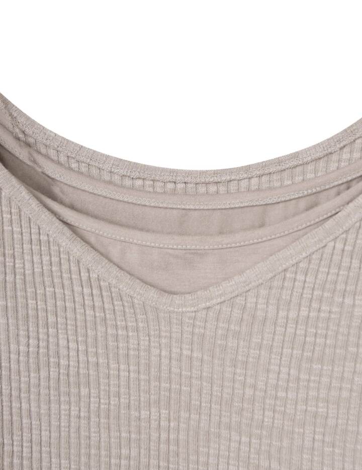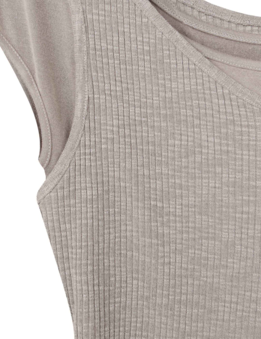 겉감(면 58% 레이온 38% 폴리우레탄 4%): 슬럽 골지 조직으로 입체감이 느껴지며 신축성이 좋아 활동하기 편안합니다. 안감(레이온 95% 폴리우레탄 5%): 모달스판 소재를 사용하여 피부에 닿는 촉감이 매우 부드럽고 가볍습니다.