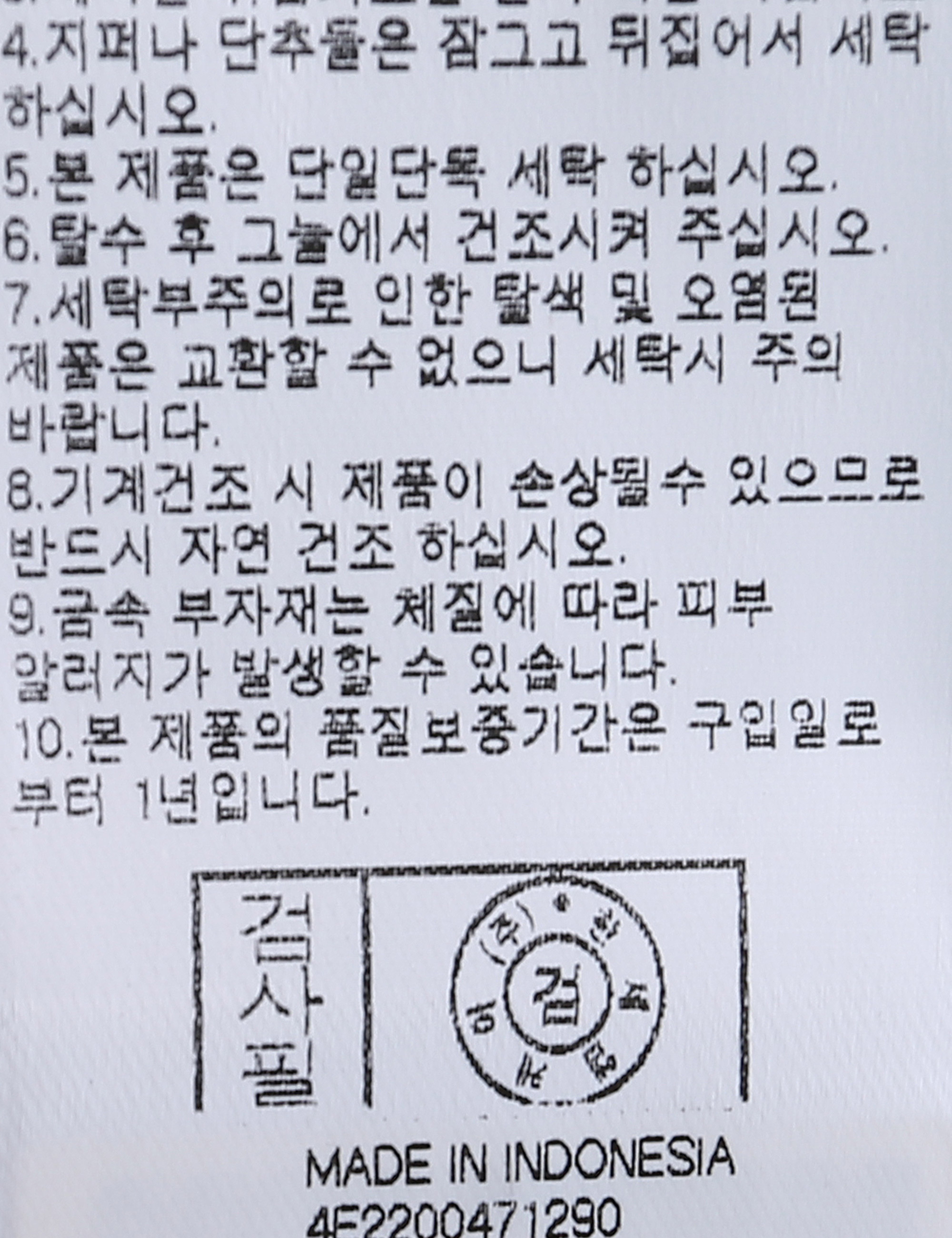 | 세탁방법 및 취급시 주의사항 | 중성세제로 단 시간내에 세탁하십시오.(케어라벨참고) |