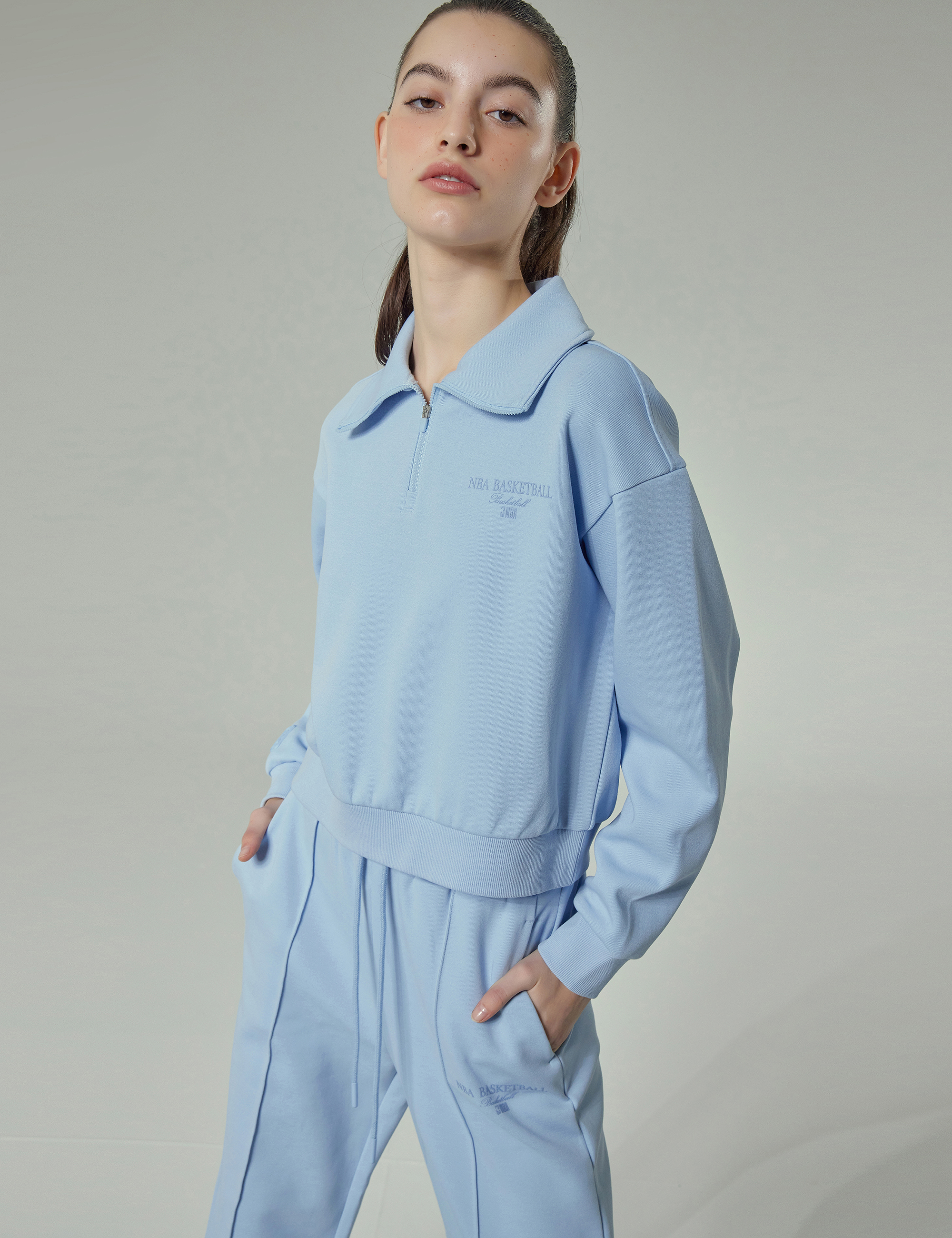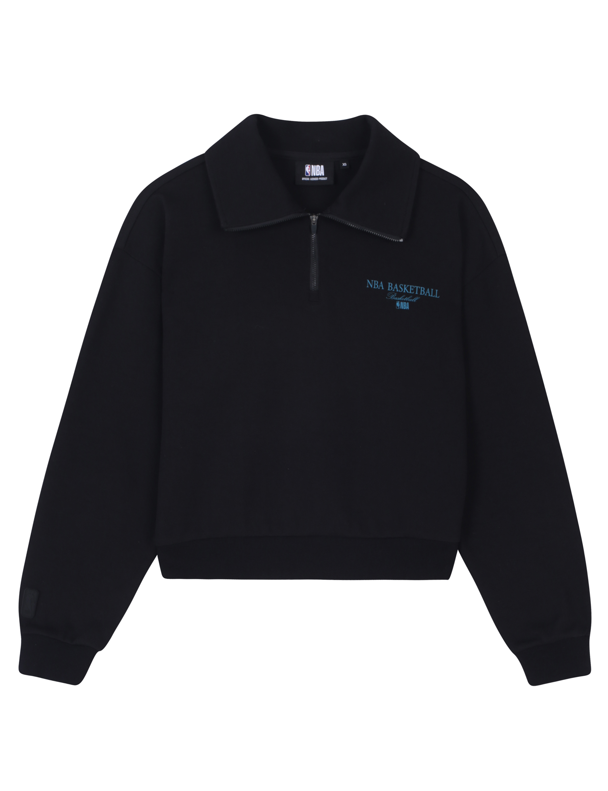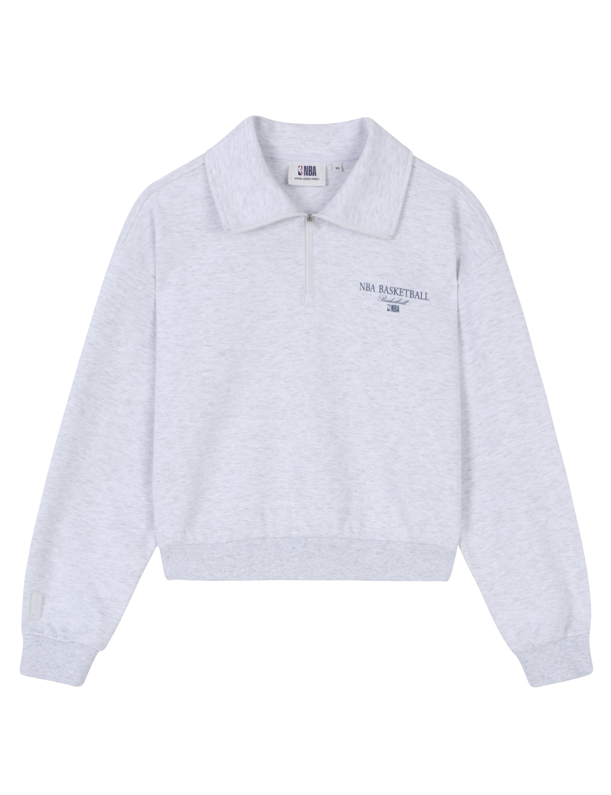 트렌디한 착장이 가능한 크롭형태의 맨투맨으로 가슴과 등판에 NBA 레터가 작업되어 포인트를 준 스타일로 지퍼를 오픈하면 빅카라 형태의 스타일로도 착장이 가능
