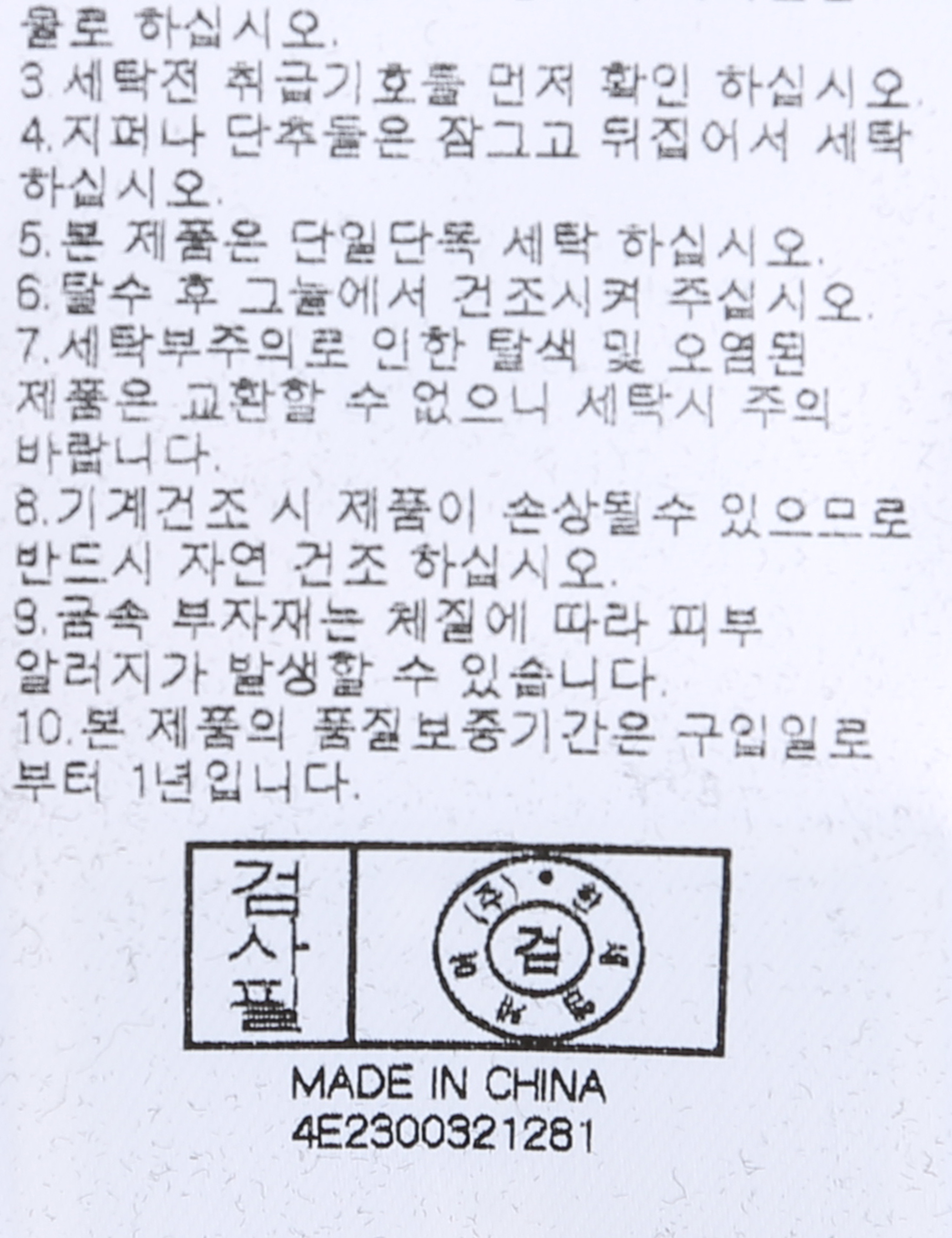 | 세탁방법 및 취급시 주의사항 | 중성세제로 단 시간내에 세탁하십시오.(케어라벨참고) |