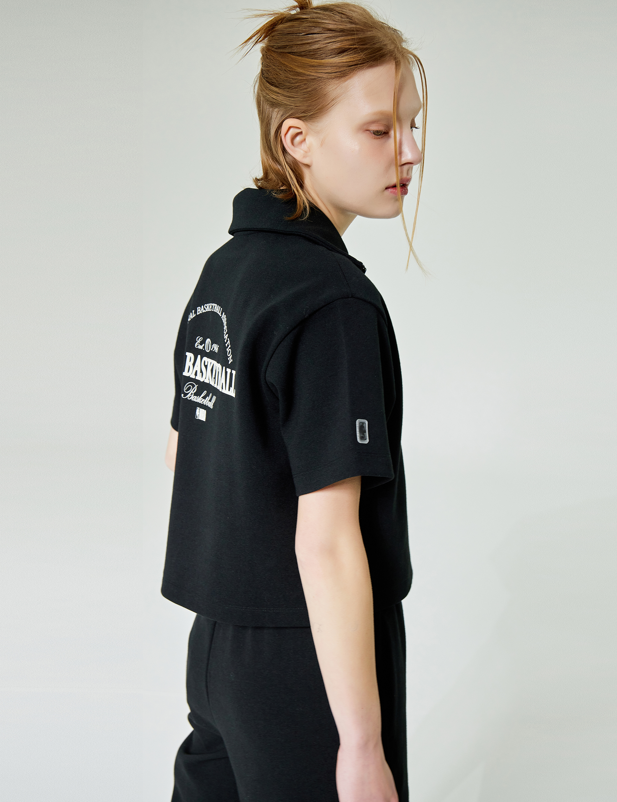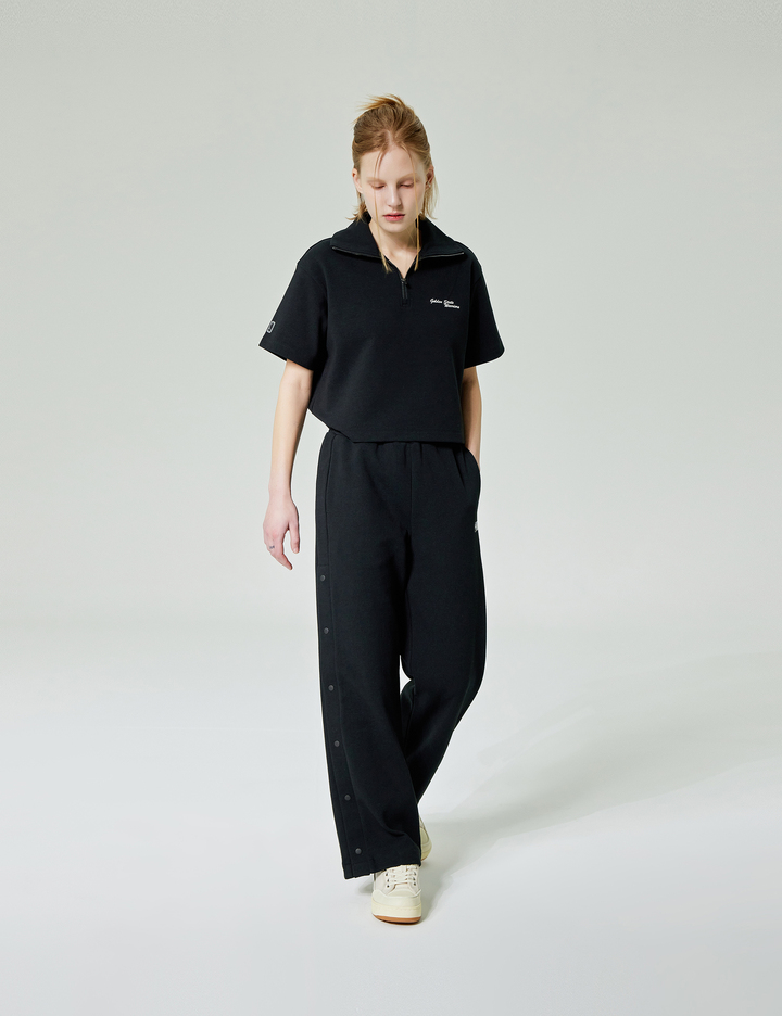 부드러운 특양면 원단을 사용하여 착용감이 우수하고 지퍼를 열면 카라 형태의 반집업 스타일로도 연출이 가능한 여성 전용 하프넥 크롭 티셔츠
