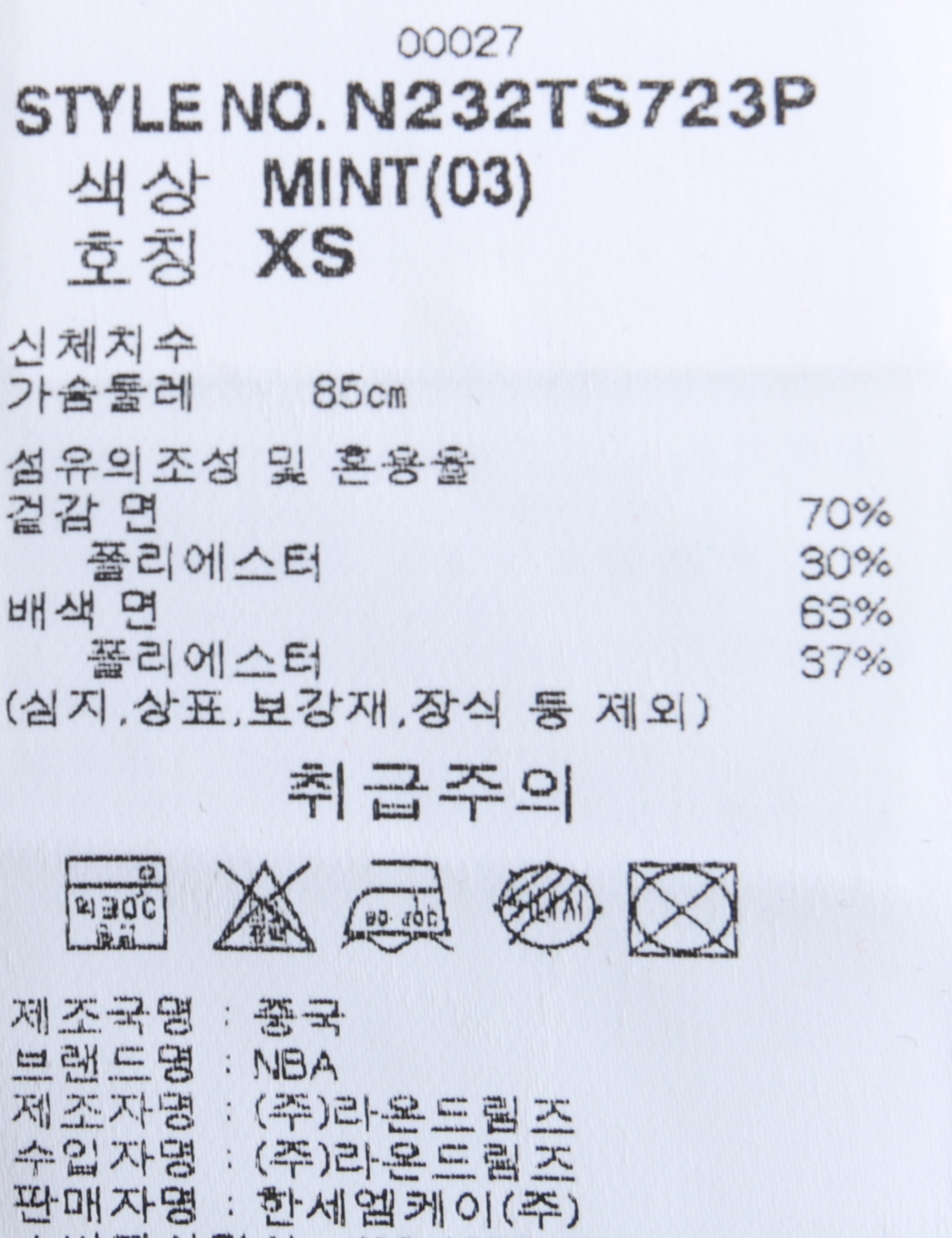 제품소재 [겉감]면70% 폴리에스터30% [배색]면63% 폴리에스터37%