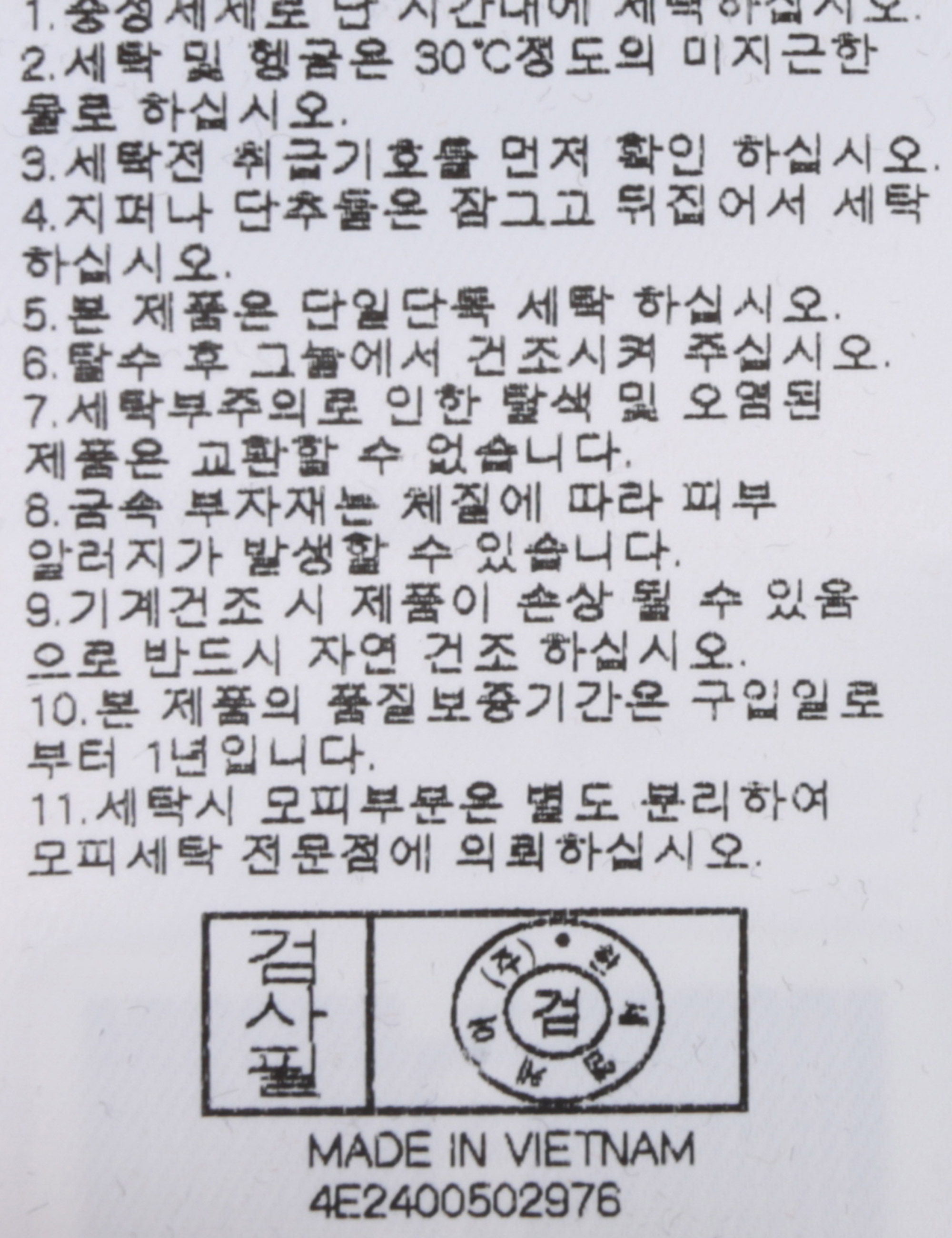 | 세탁방법 및 취급시 주의사항 | 본 제품은 손세탁 하십시오.(케어라벨참고) |