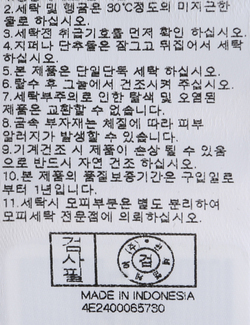 | 세탁방법 및 취급시 주의사항 | 본 제품은 손세탁 하십시오.(케어라벨참고) |