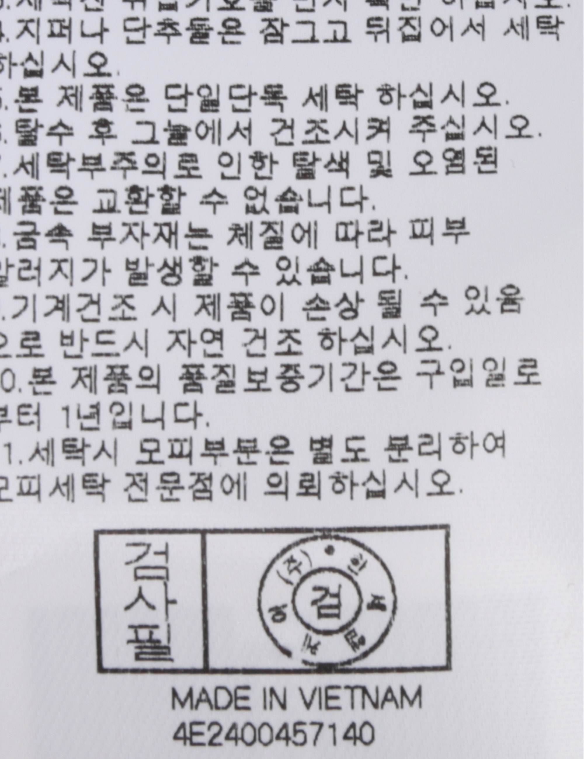 | 세탁방법 및 취급시 주의사항 | 본 제품은 손세탁 하십시오.(케어라벨참고) |
