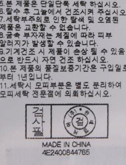 | 세탁방법 및 취급시 주의사항 | 본 제품은 손세탁 하십시오.(케어라벨참고) |