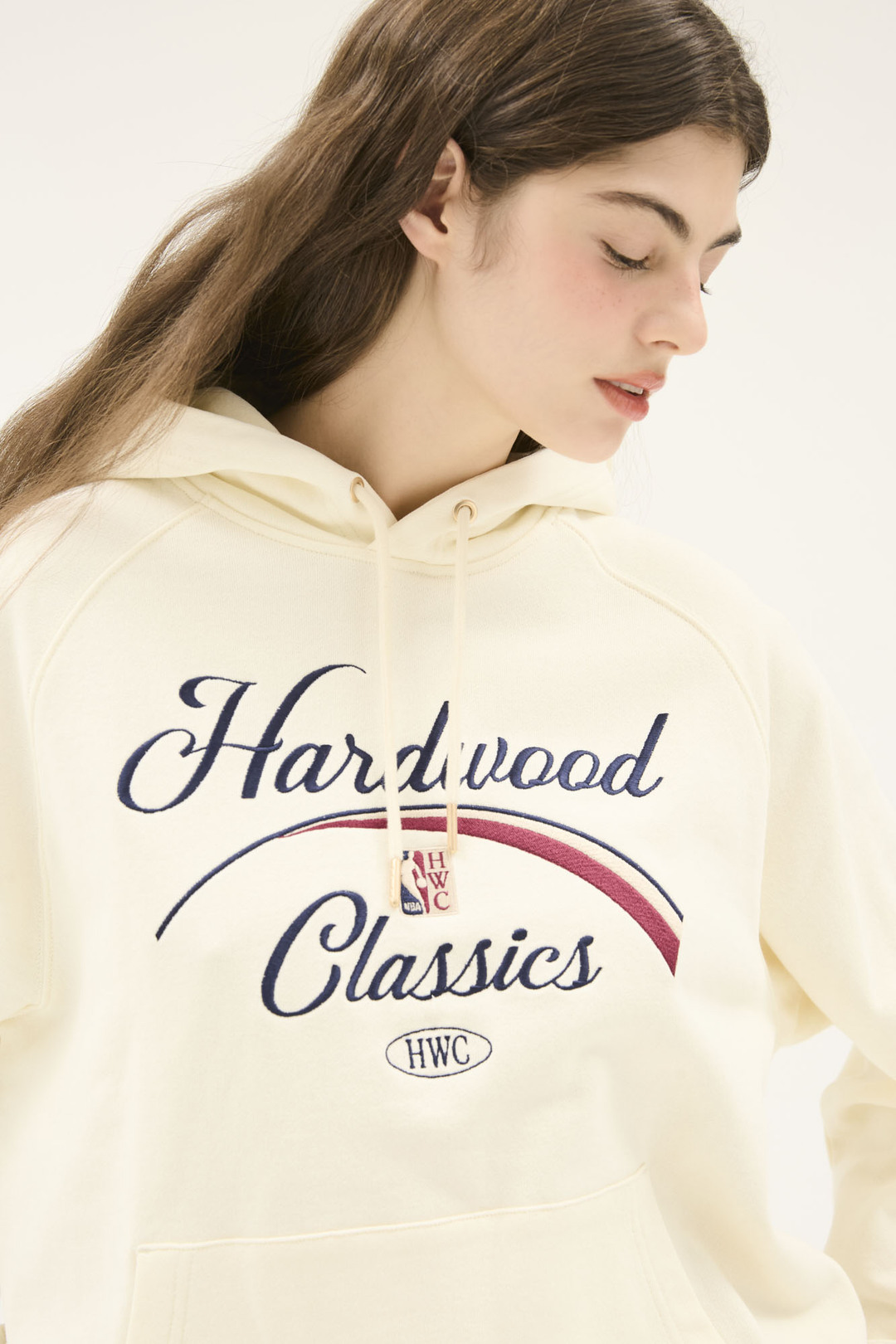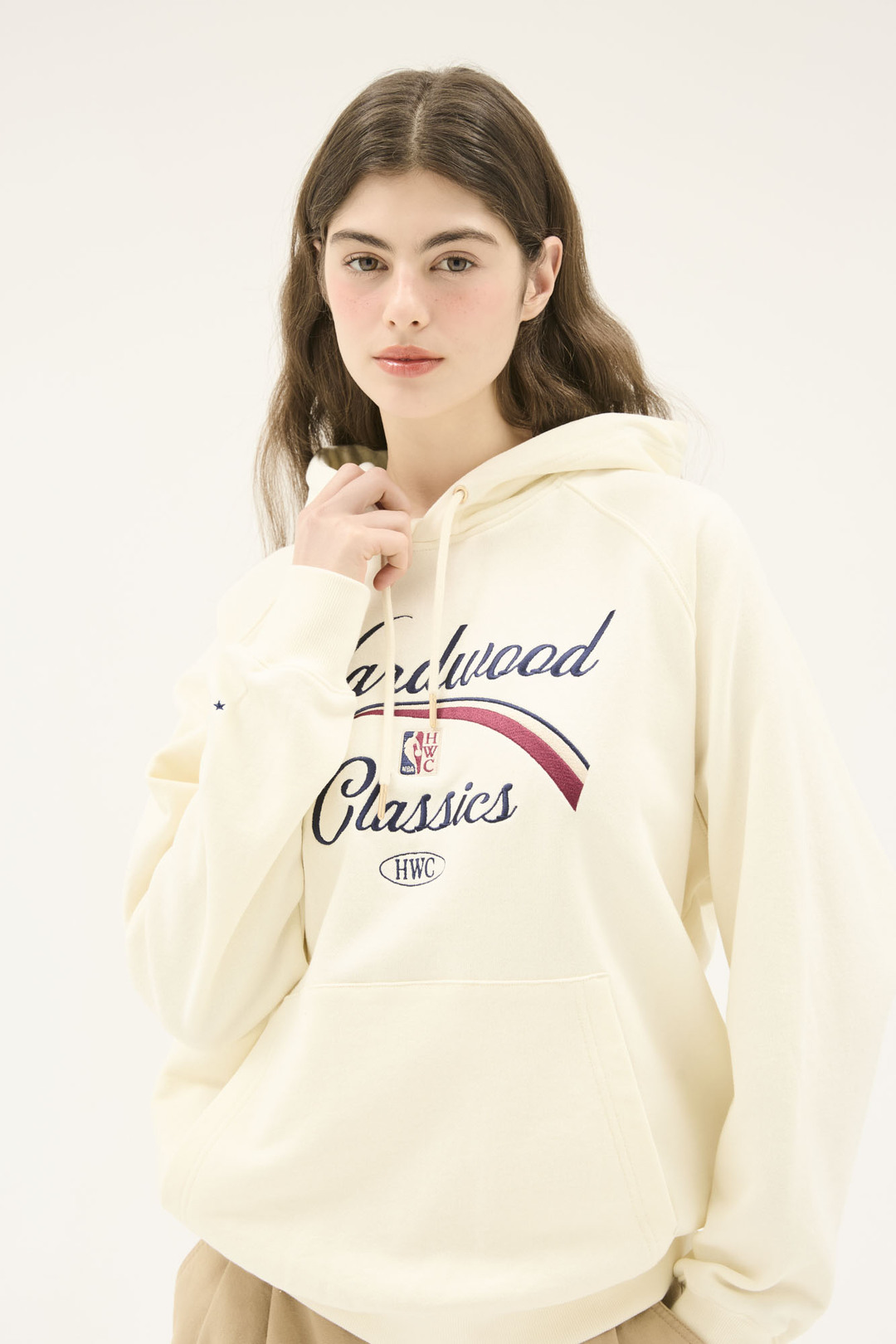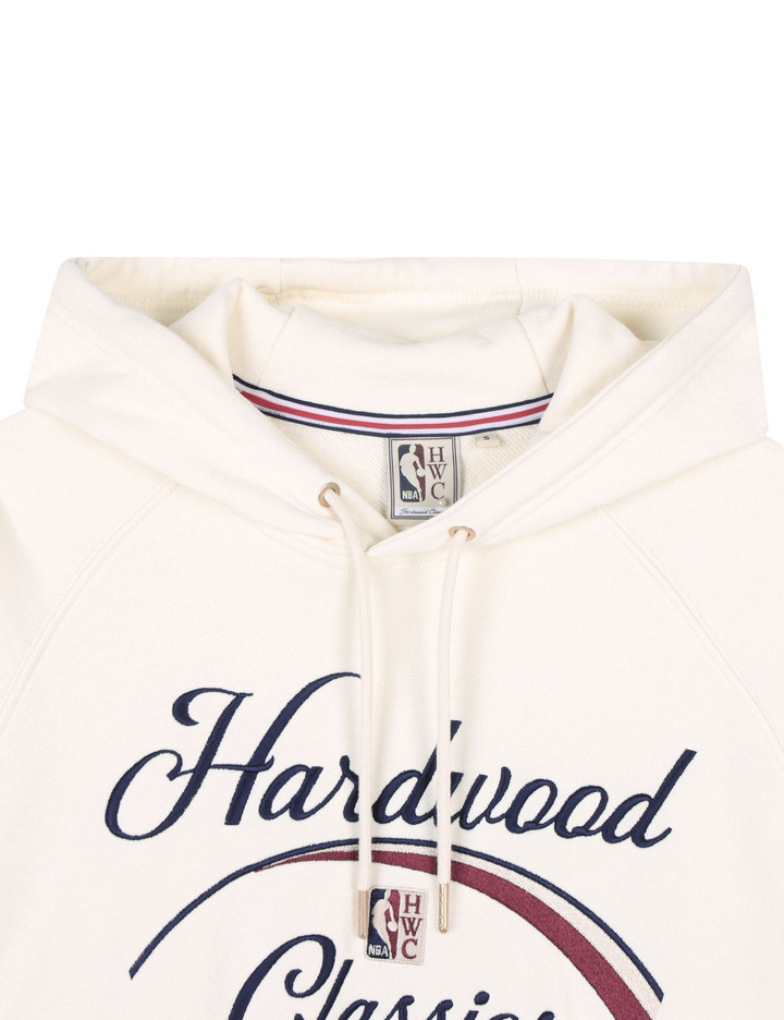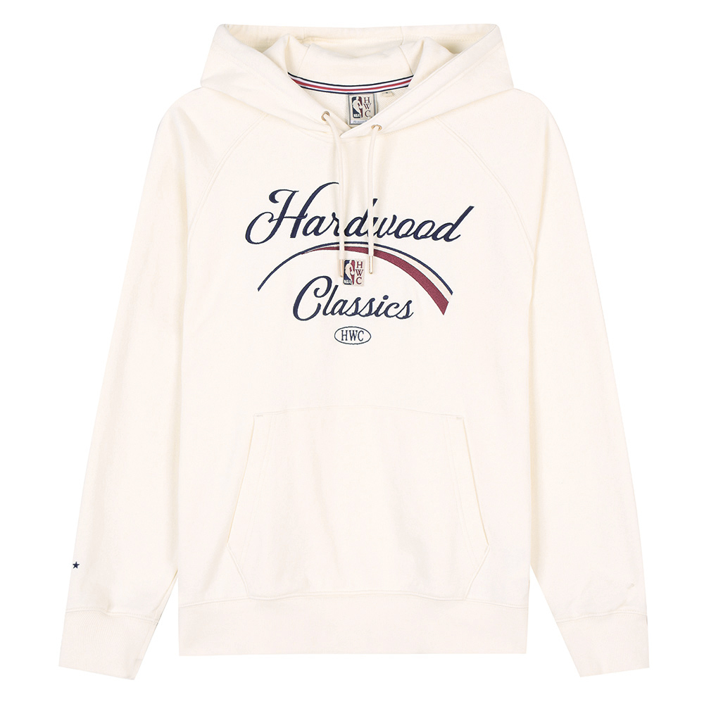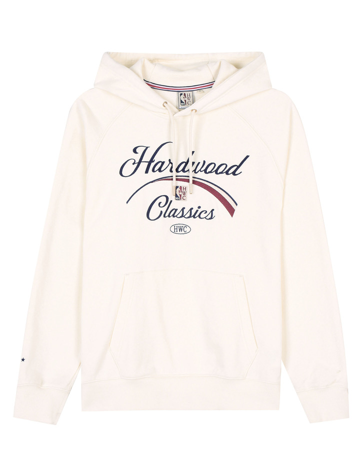 NBA의 레전드 장면을 보여주는 'HARDWOOD CLASSIC' 라인의 후드 티셔츠 스타일로 클래식한 아트웍과 골드컬러의 부자재가 특징