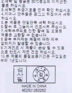 | 세탁방법 및 취급시 주의사항 | 본 제품은 손세탁 하십시오.(케어라벨참고) |