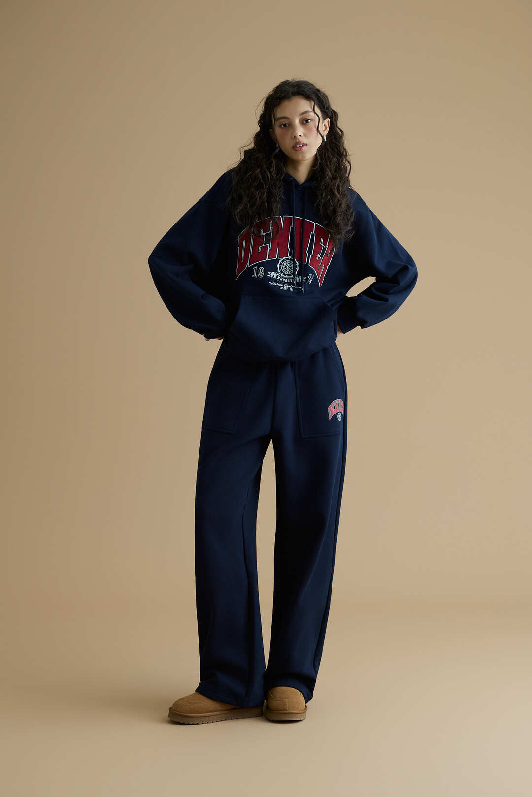 - 코듀로이 원단을 사용한 아치형 아플리케 그래픽이 포인트