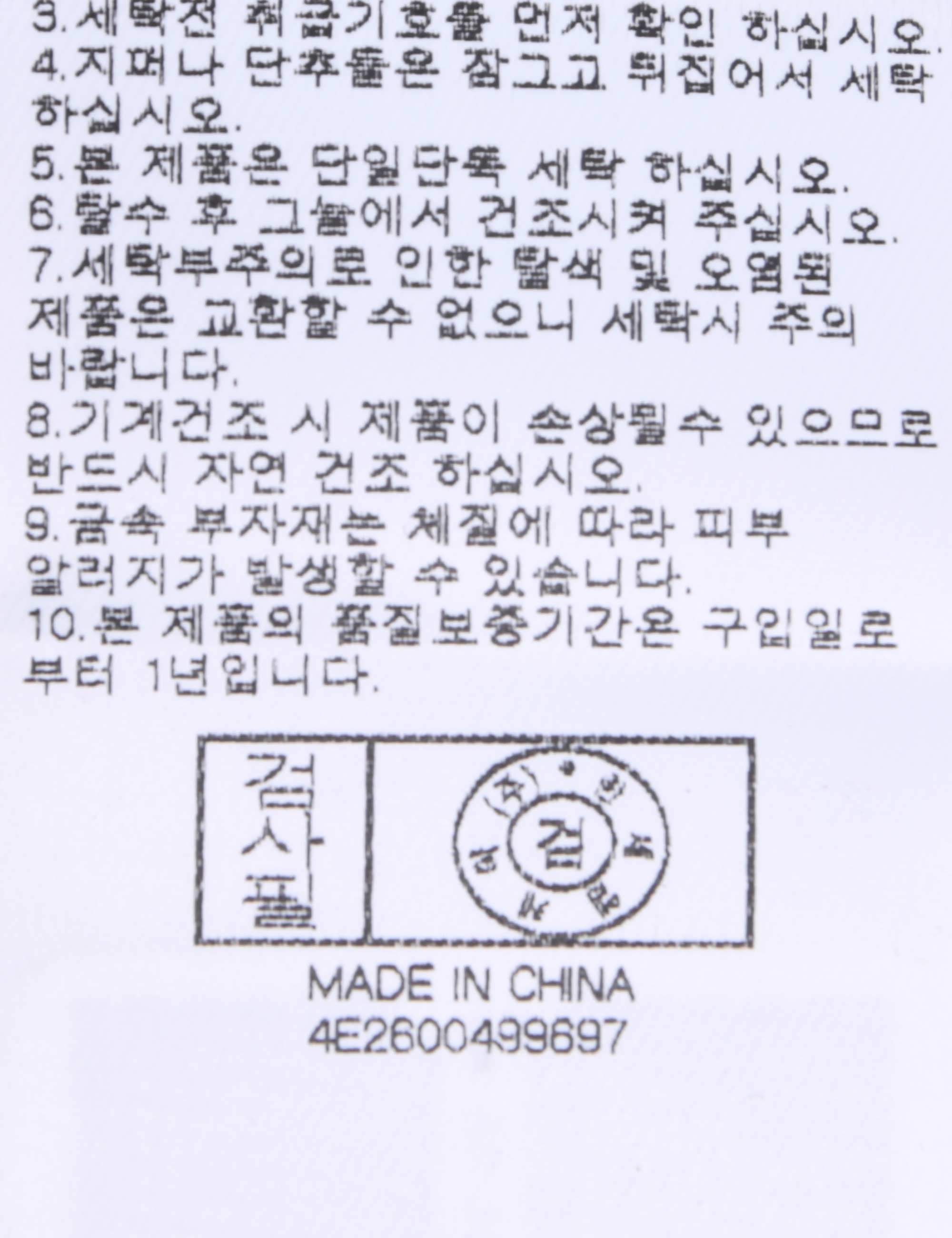 세탁방법 및 취급시 주의사항 중성세제로 단 시간내에 세탁하십시오.(케어라벨참고)