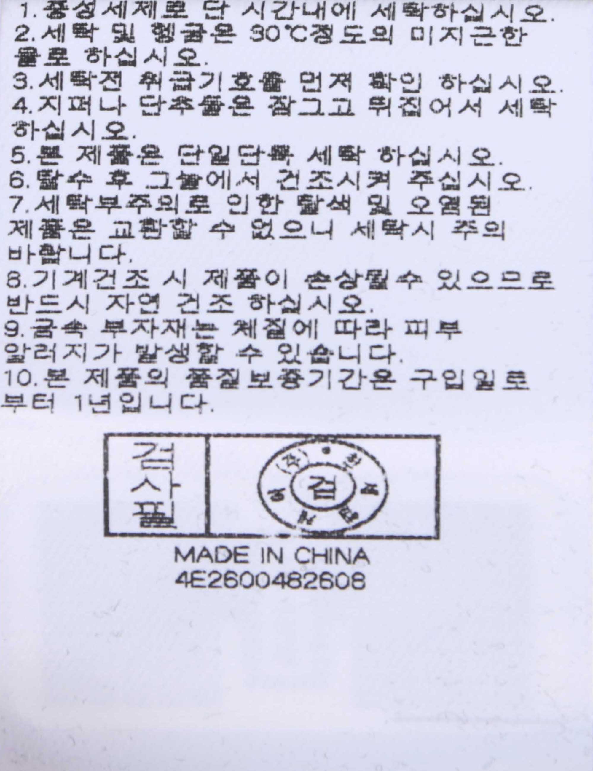 | 세탁방법 및 취급시 주의사항 | 중성세제로 단 시간내에 세탁하십시오.(케어라벨참고) |
