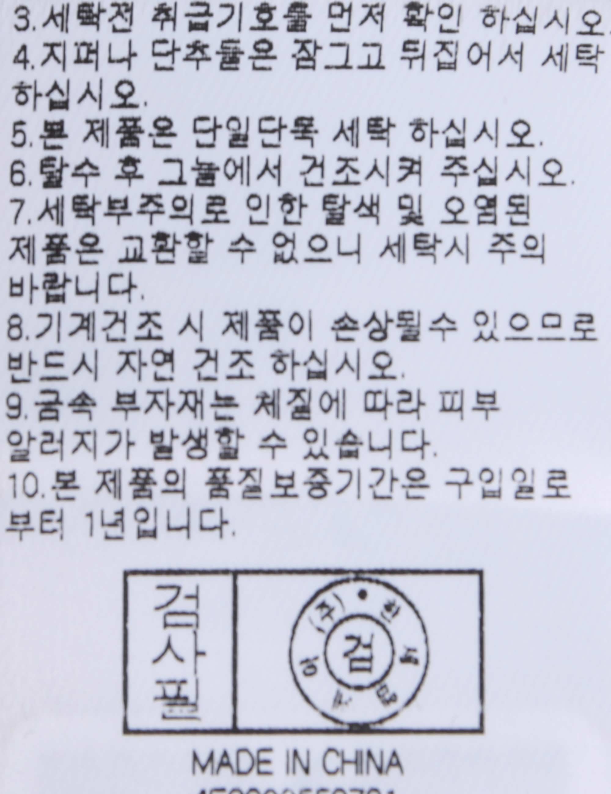 | 세탁방법 및 취급시 주의사항 | 중성세제로 단 시간내에 세탁하십시오.(케어라벨참고) |