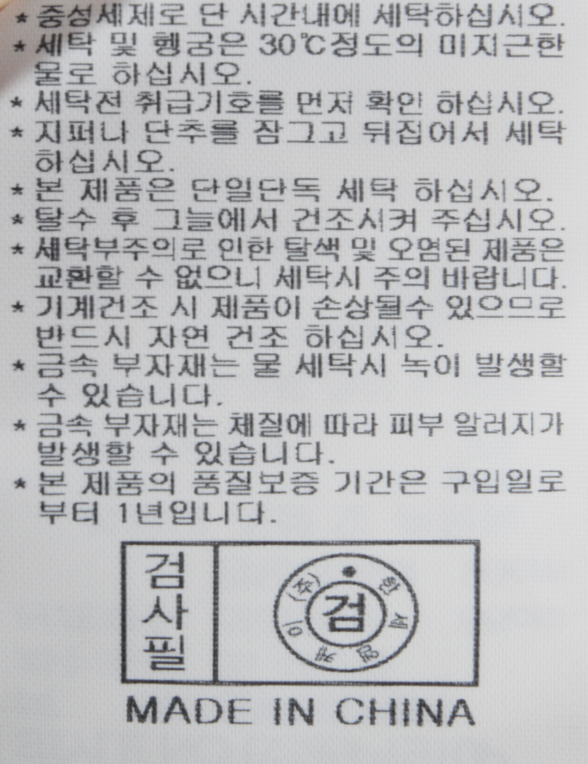 | 세탁방법 및 취급시 주의사항 | 중성세제로 단 시간내에 세탁하십시오.(케어라벨참고) |