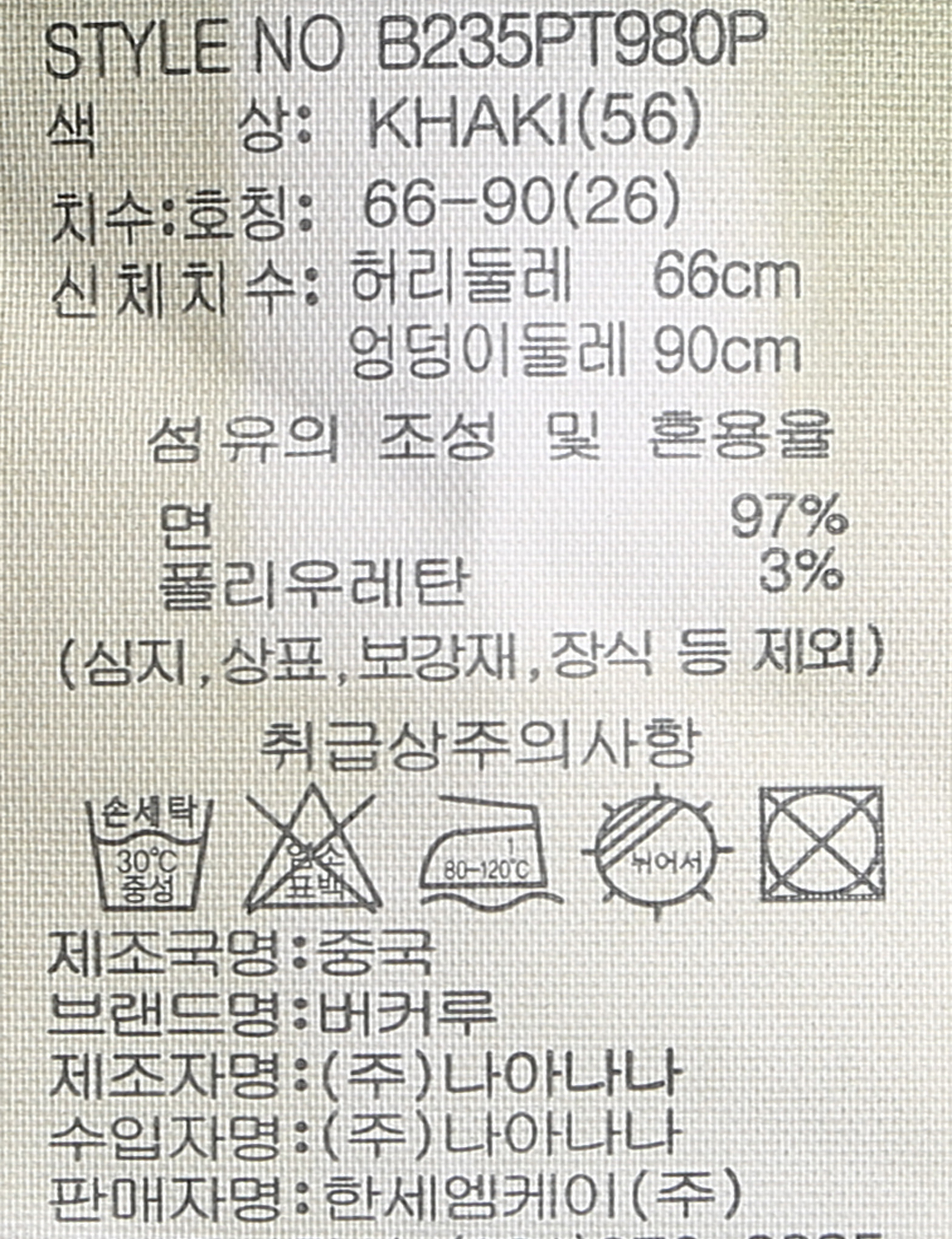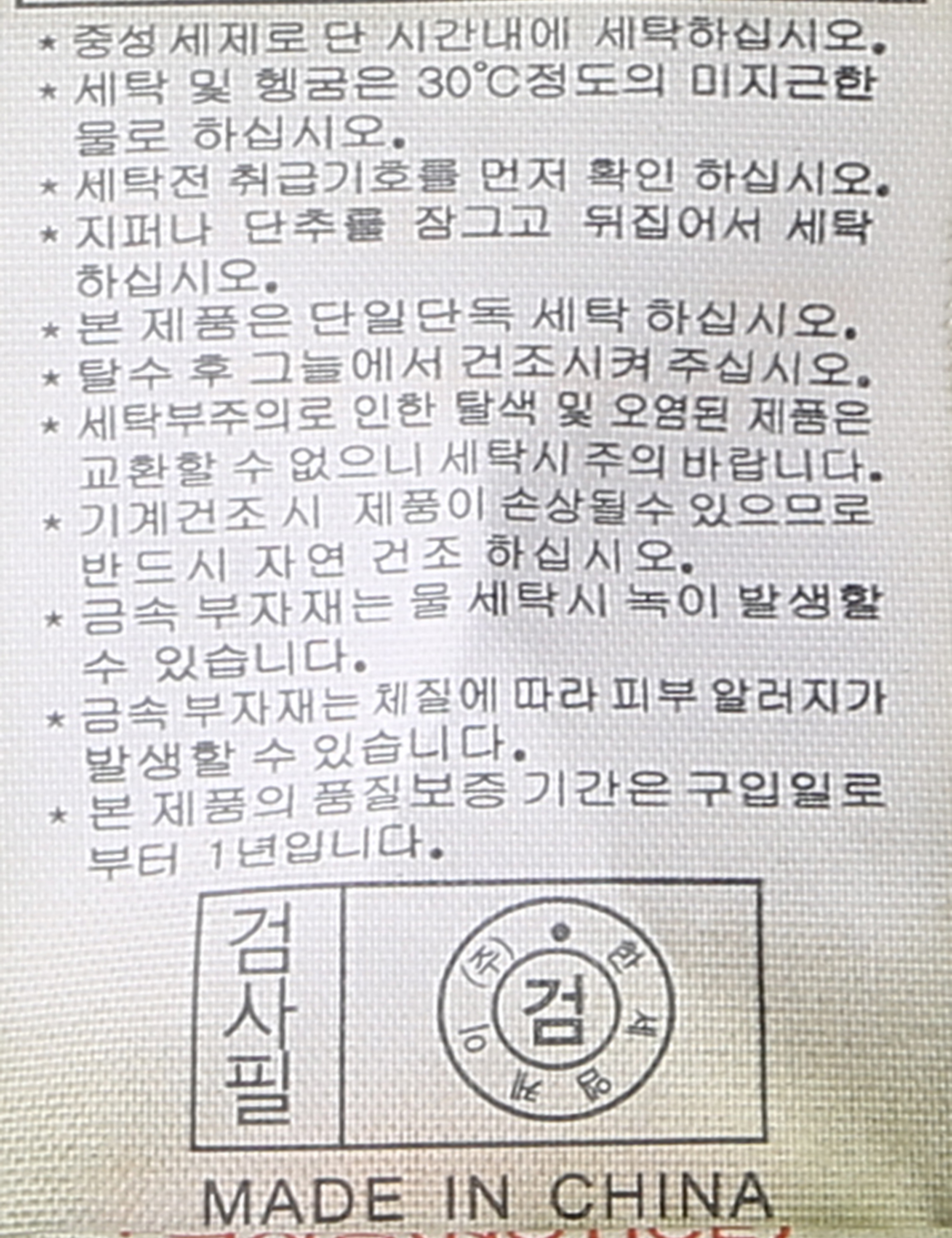 세탁방법 및 취급시 주의사항 중성세제로 단 시간내에 세탁하십시오.(케어라벨참고)